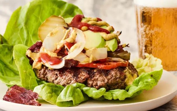4 Place a burger on each bun half, or lettuce leaf, top with pastrami, a pile of onions, avocado slices, tomato slice and ketchup and mustard.