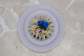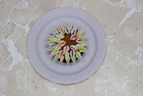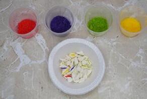 Dip the sticky side of 20 petals into green sugar, 6 petals into pink sugar, 6 petals into yellow sugar, and 6 petals into purple sugar, then put them back into the bowl.