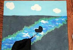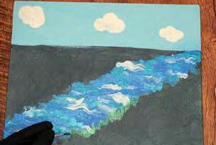 Add some clouds by drawing circles that touch each other. -Canvas -Cup of Water -One Medium Paint Sponge -One Medium Paintbrush