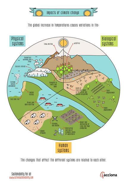 Climate change affects Physical System, Biological System and Human System.