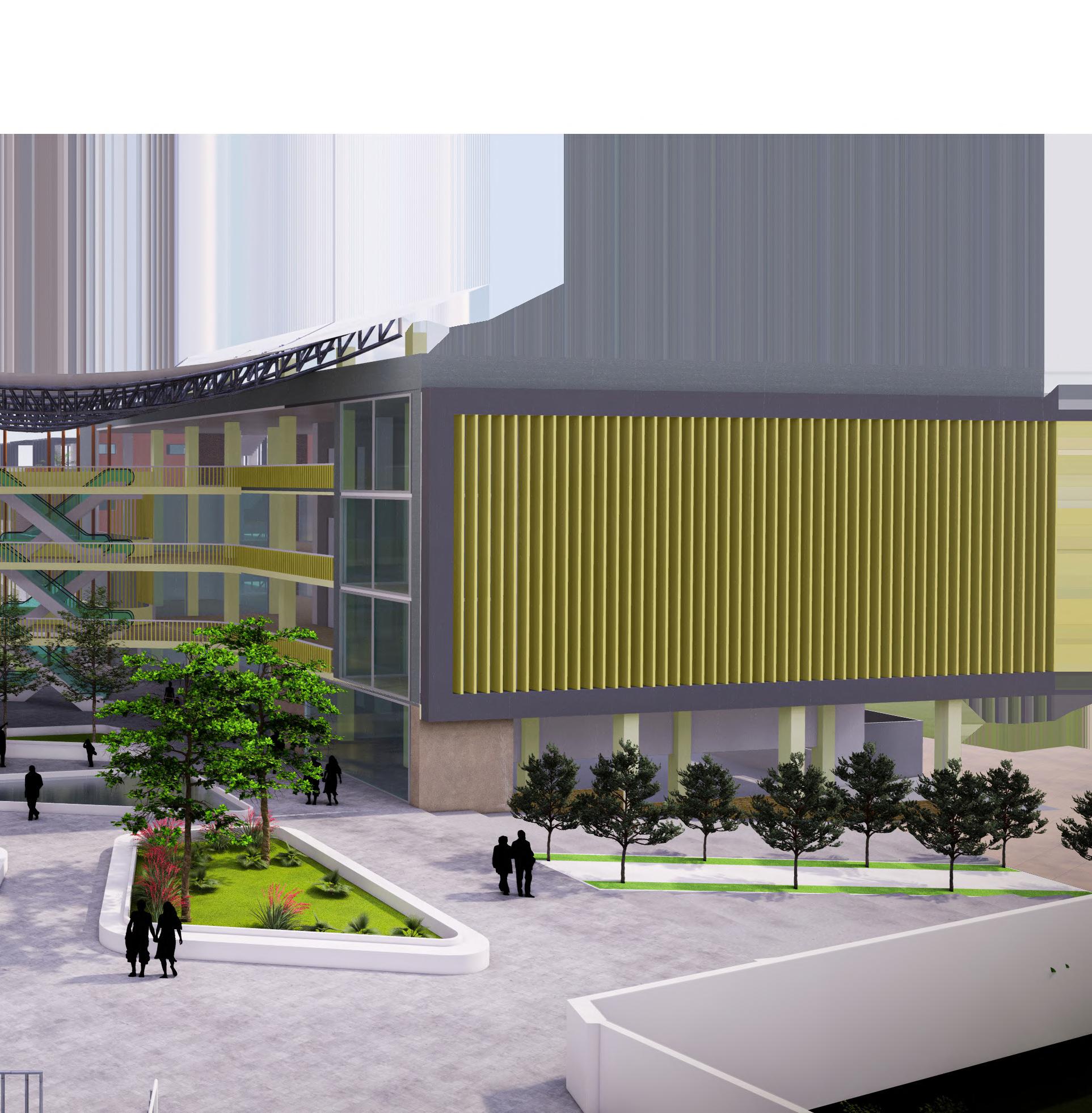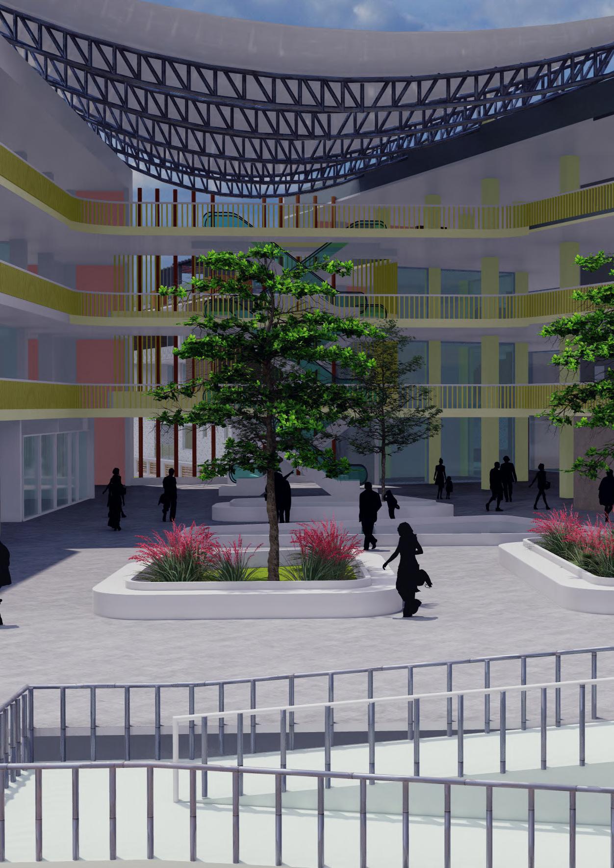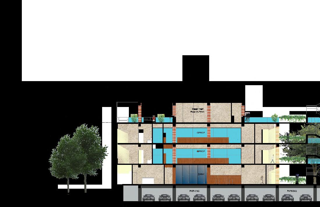 The existing site has an irregular shape, which poses a unique challenge for the proposed building design. Buildings are align with site considering public space and maximizing natural light. Plaza in the center of the building serves a dual purpose: not only does it provide a communal gathering space for visitors and occupants, but it also injects a sense of vibrancy and life into the area. The plaza becomes a focal point, drawing people in with its inviting atmosphere and serving as a hub of activity.