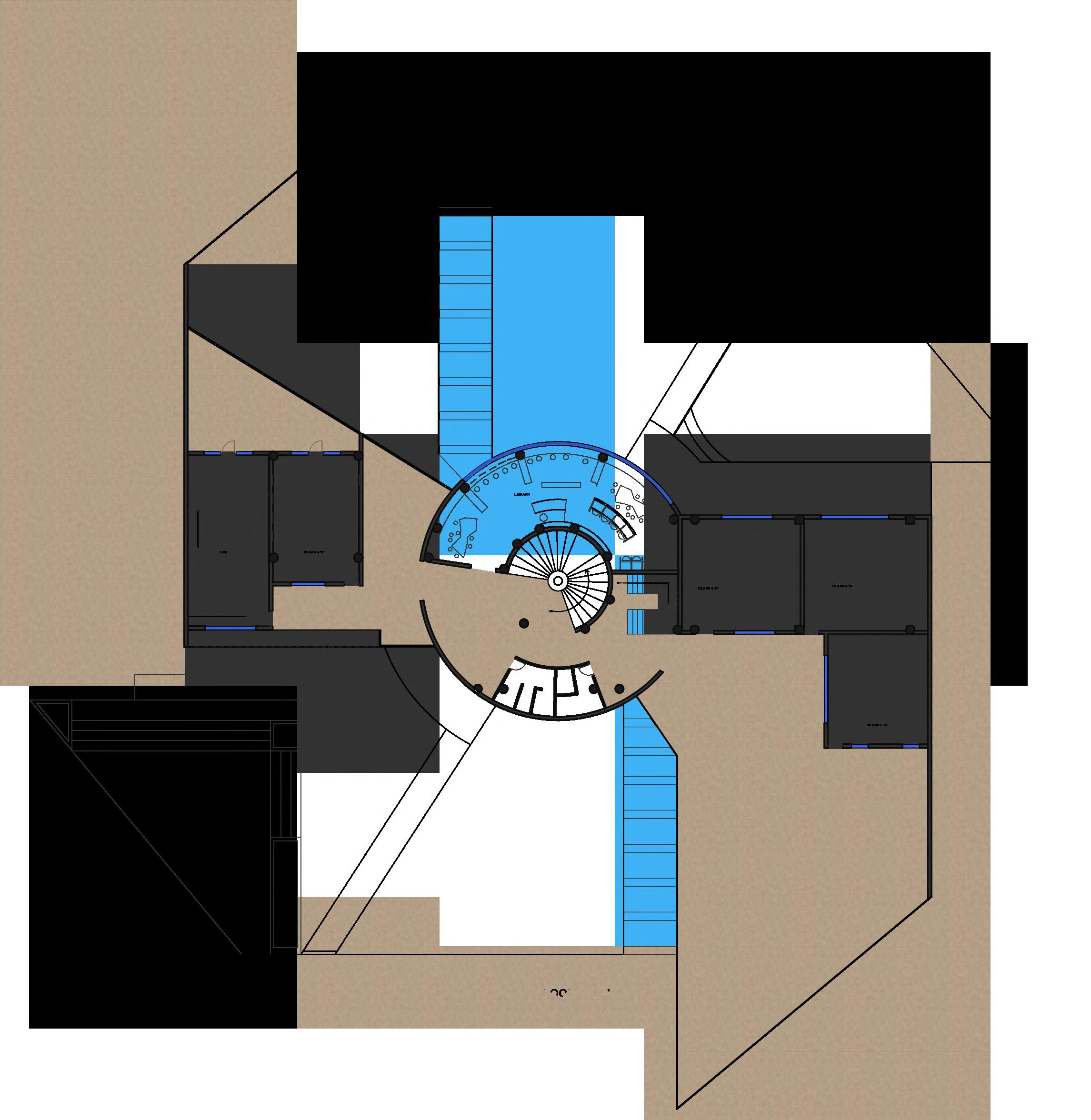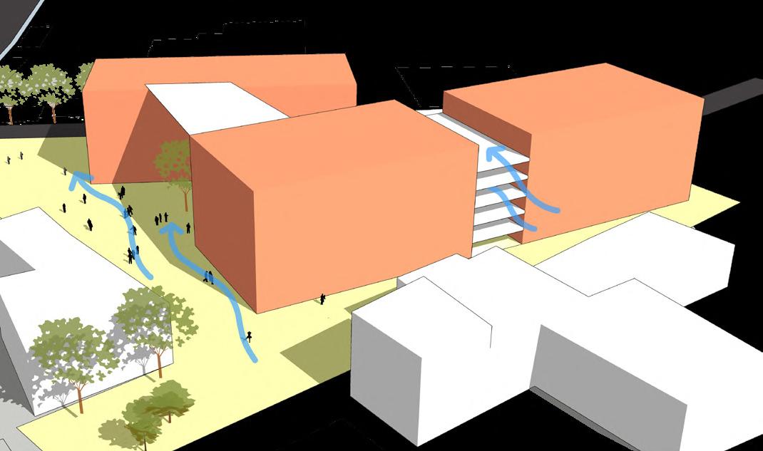 Mass is separated into two wings according to its function and connected by circle-shaped mass. The courtyard is provided in each wing for natural ventilation, daylight and leisure space.