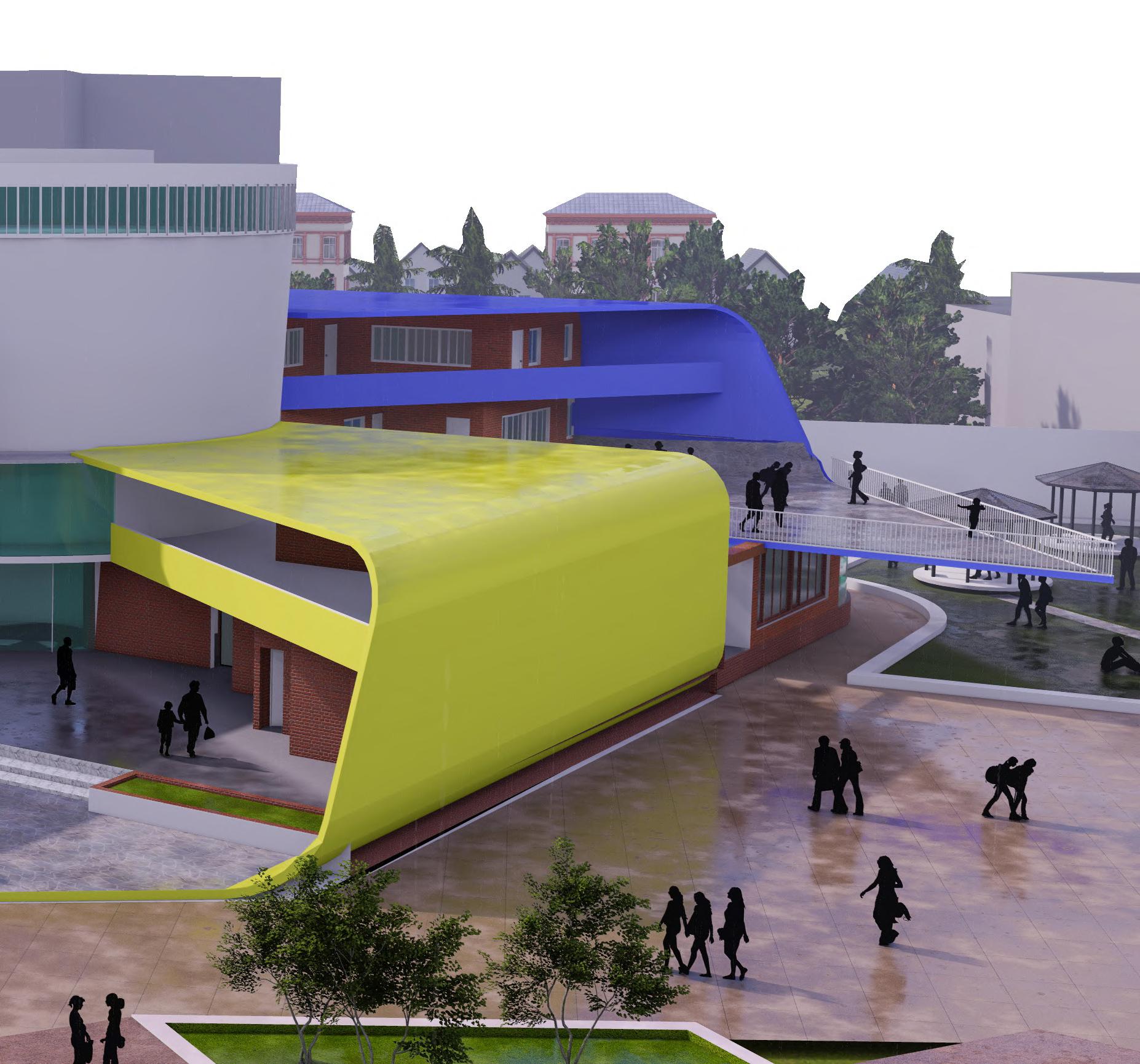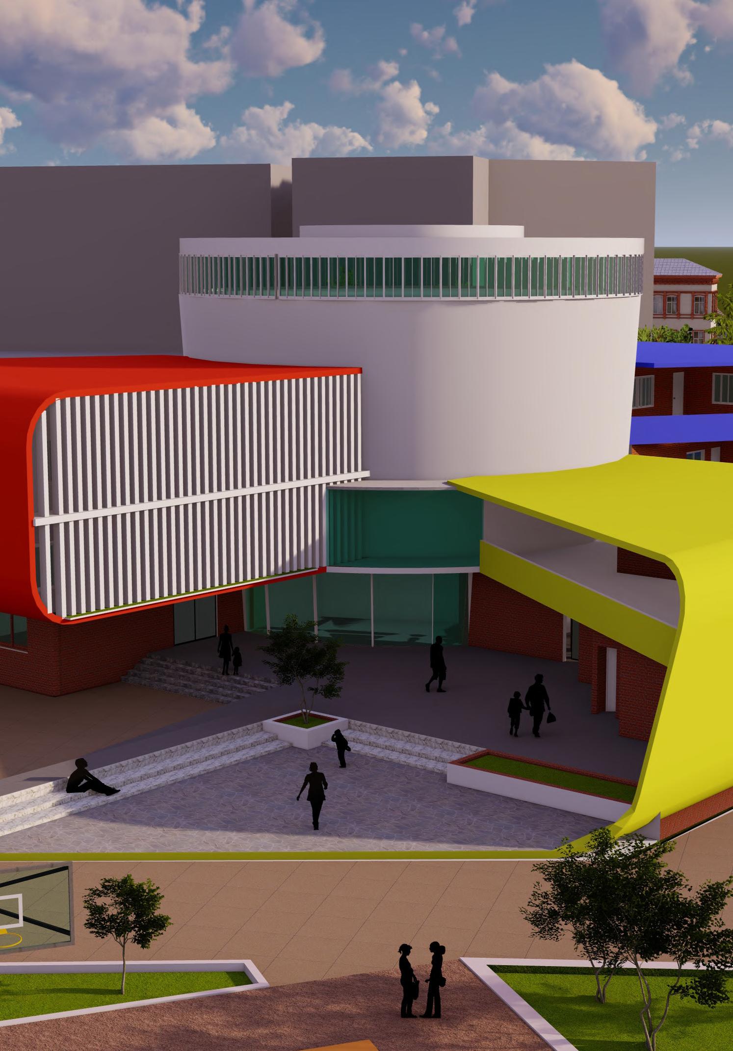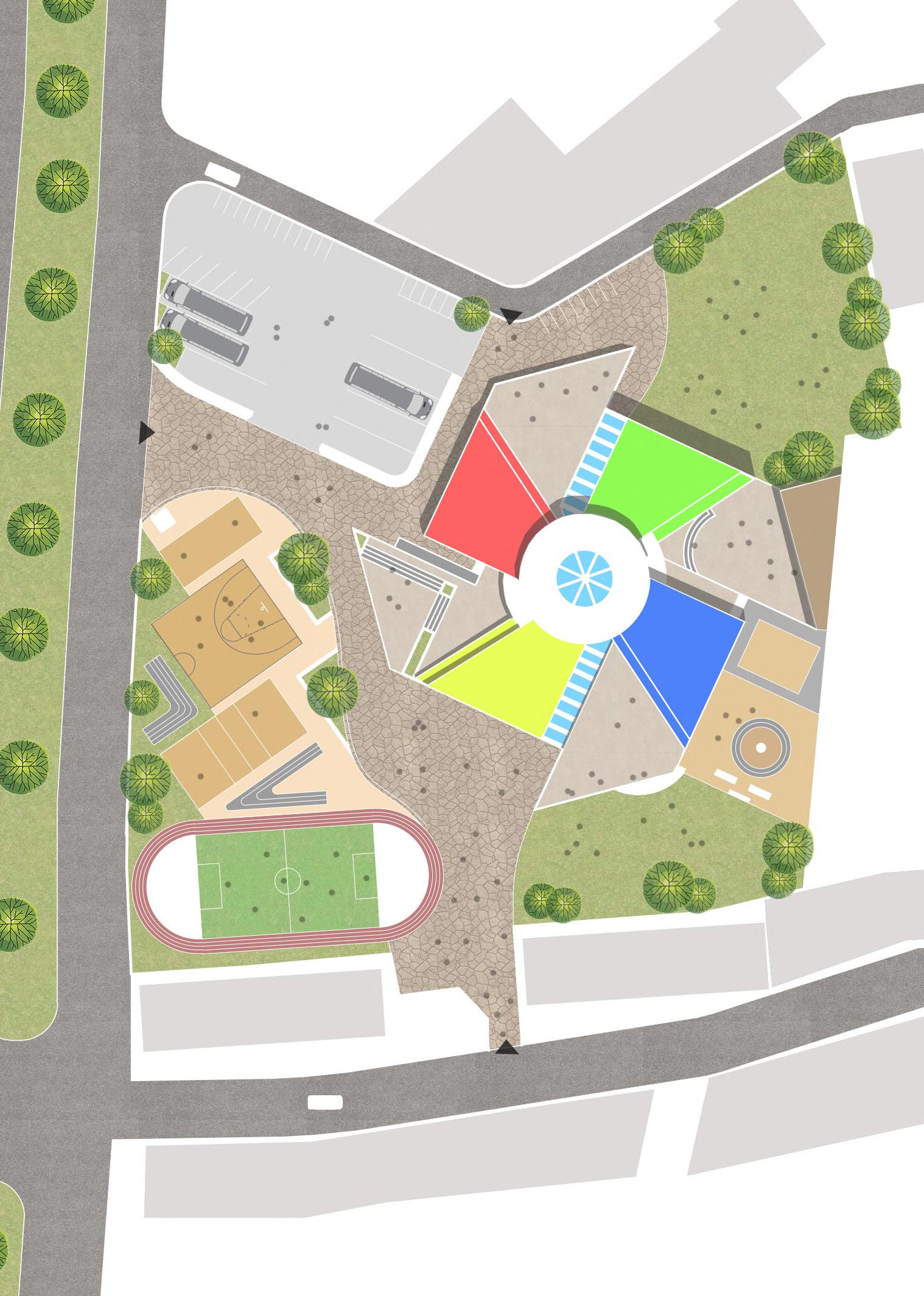 Primary school should have an environment that is safe, welcoming, and conducive to learning and development for young children. Taking inspiration from the paper windmill, a form that every child can relate. Like paper windmill consists of a central axis and rotating blades, it has a main staircase in centre which is connected to different wing. Bright and vibrant color emphasis the form and make visually appealing and inviting to young children
