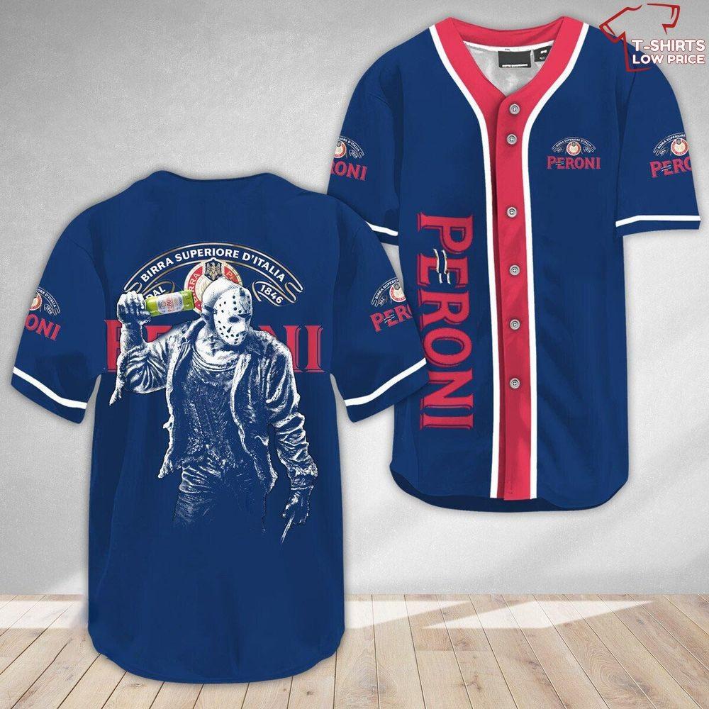 The Horror Jason Voorhees Peroni Beer Baseball Jersey is a unique and stylish piece of clothing that appeals to both men and women. The jersey features the infamous Jason Voorhees mask prominently displayed on the front, with the number 13 on the back to represent Friday the 13th. The jersey also includes the Peroni Beer logo, adding a touch of novelty to the design.