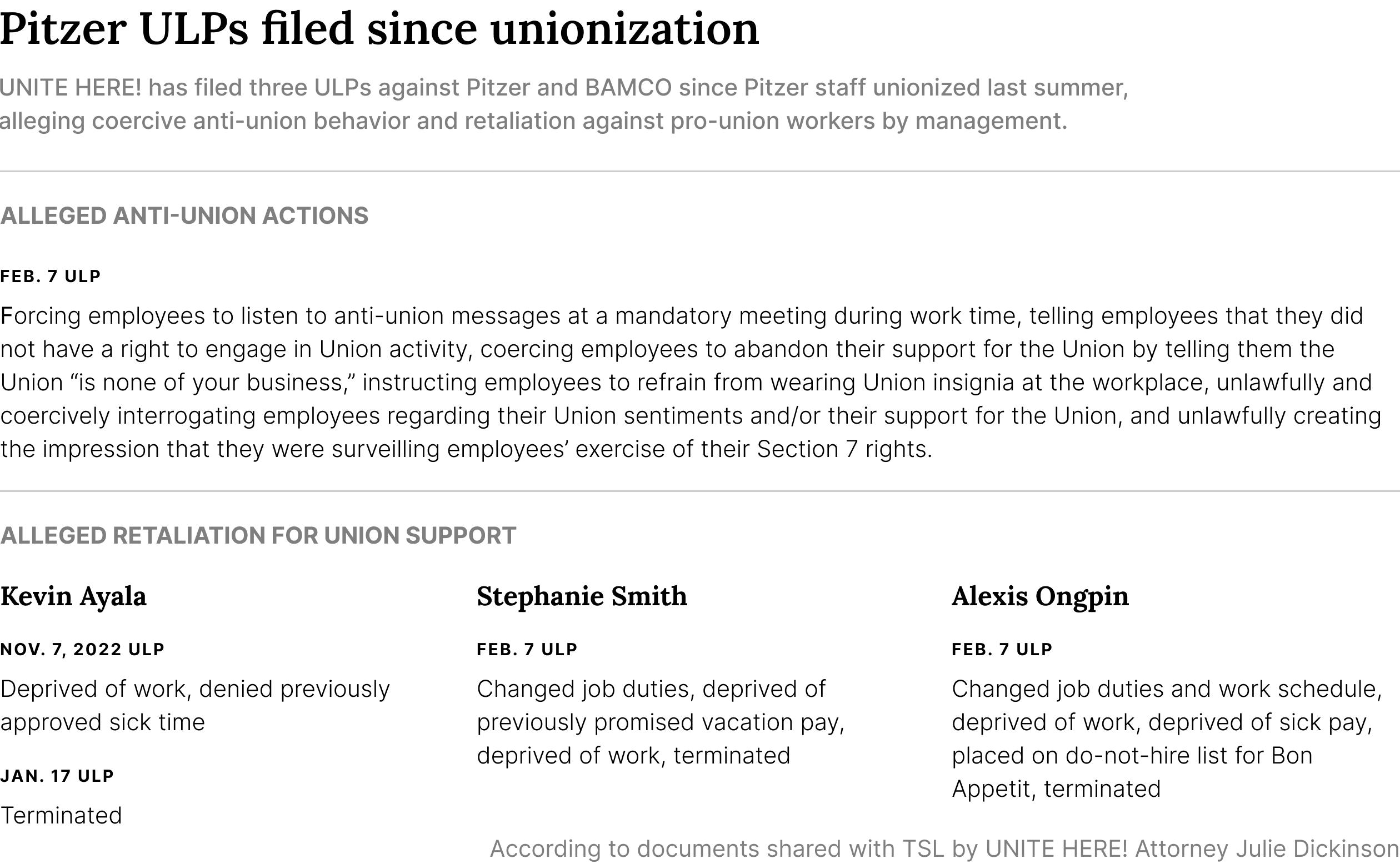 UNITE HERE! Attorney Julie Dickinson shared the latest three ULPs with TSL this Tuesday, along with a cover letter addressed to the National Labor Relations Board (NLRB). The documents allege that in the past months, managers at Pitzer and BAMCO have continuously violated employees’ rights through coercive actions and unlawful firings in an attempt to discourage support for the newly-formed union.