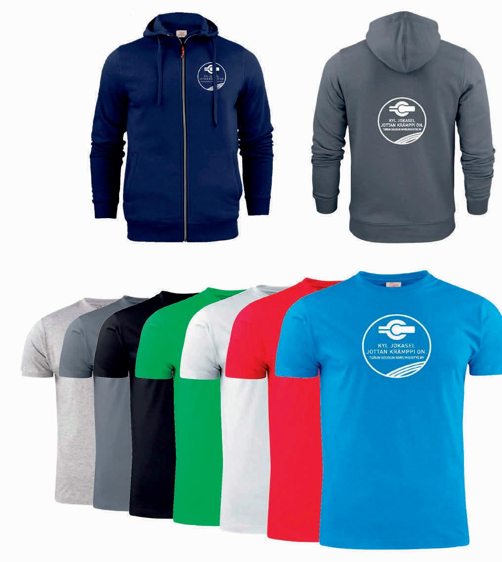 Kaikissa t-paidoissa ja huppareissa värit: valkoinen, musta, sininen, punainen, vihreä, meleerattu harmaa, tummanharmaa ja tummansininen. Painatus mustalla tai valkoisella.