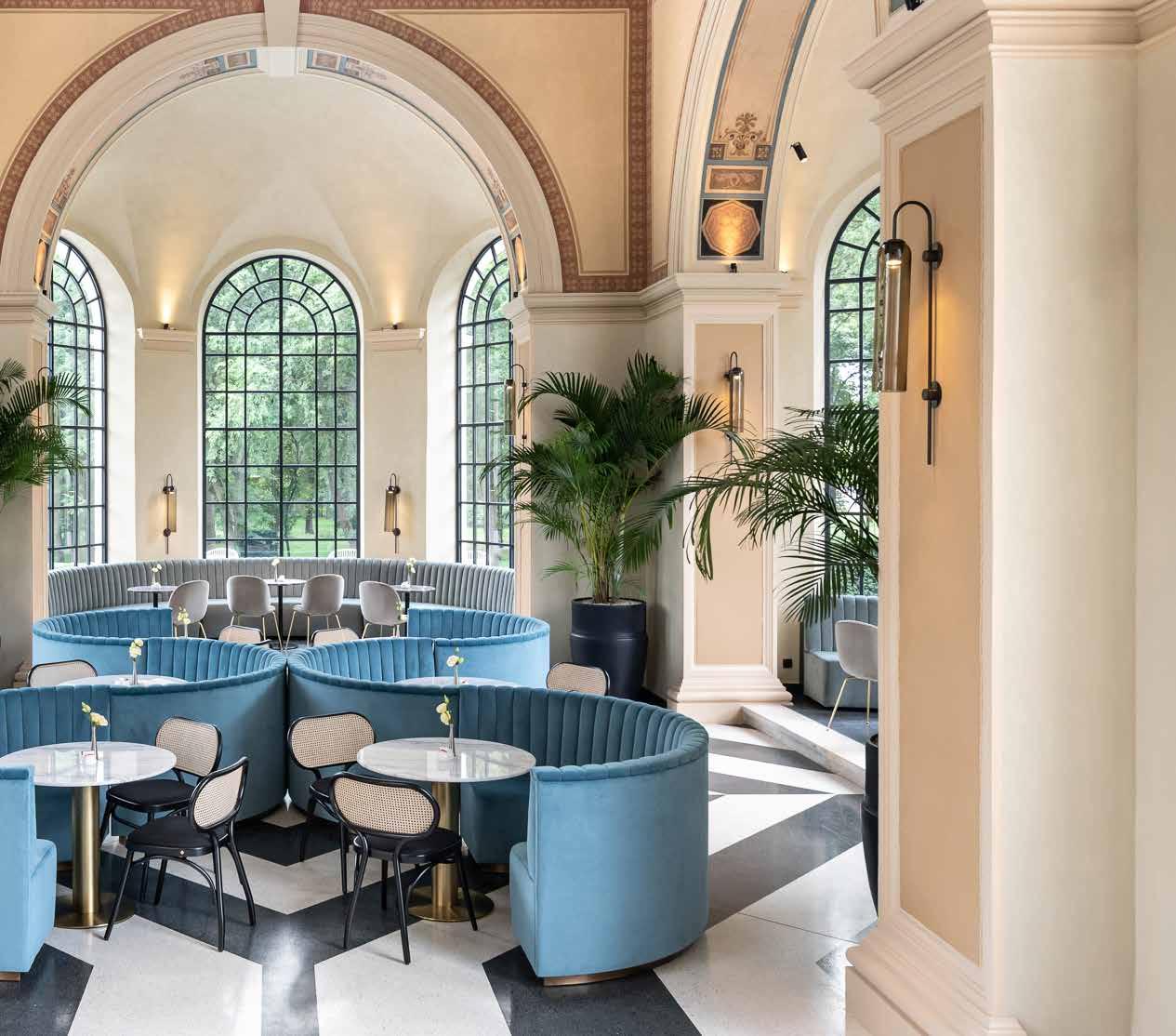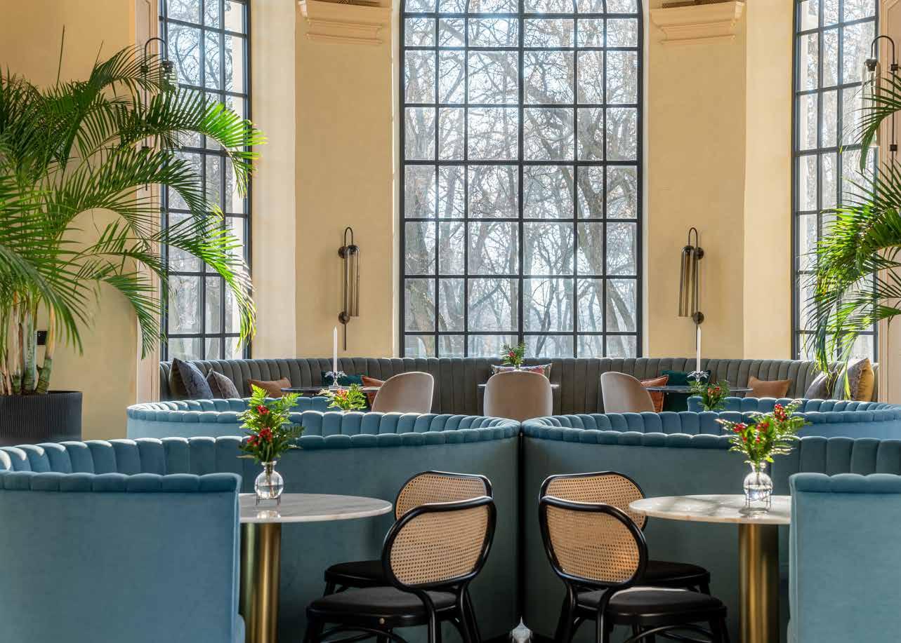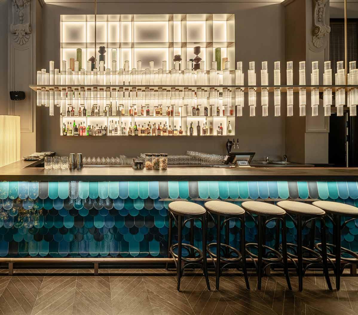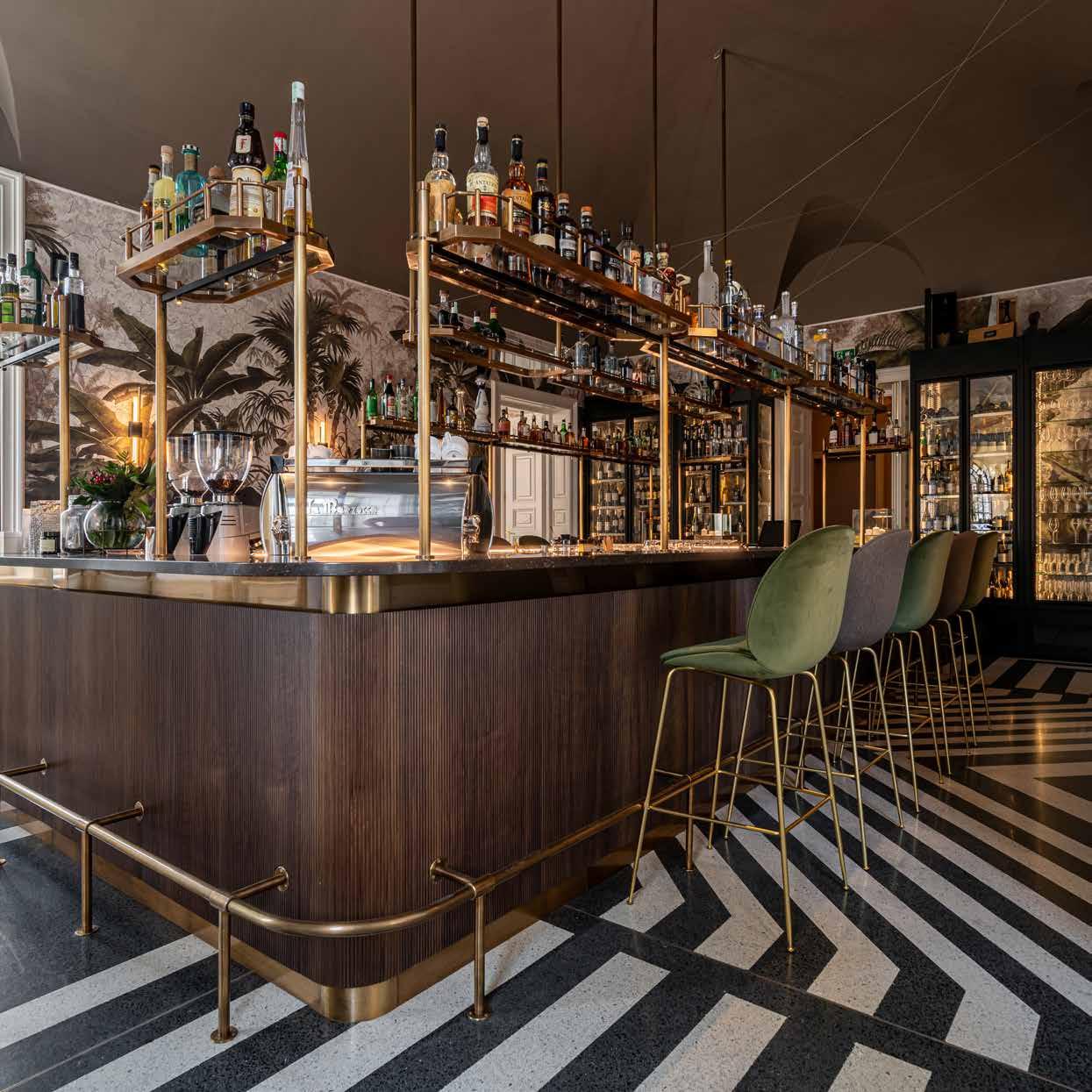 For the interior design of a restaurant in a building to be renovated, our designers chose one word to describe the whole concept: harmony. The lobby and the café are harmoniously integrated in the interior design. The concept is based on the Art Nouveau stylistic features of the building, both preserved and found in photographic archives, and their combination and reinterpretation. The rooms are characterised by strong lines, curved forms and a duality of geometric pattern, bright colours, movement and contrasts.