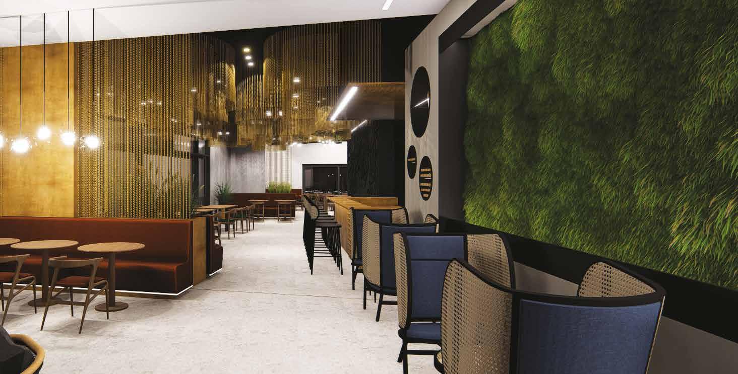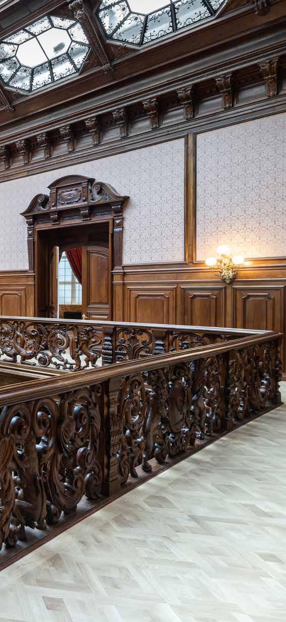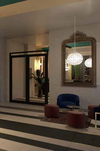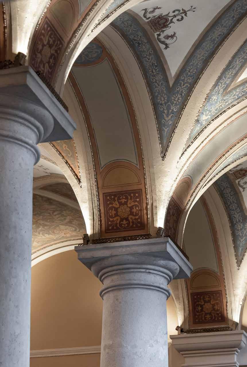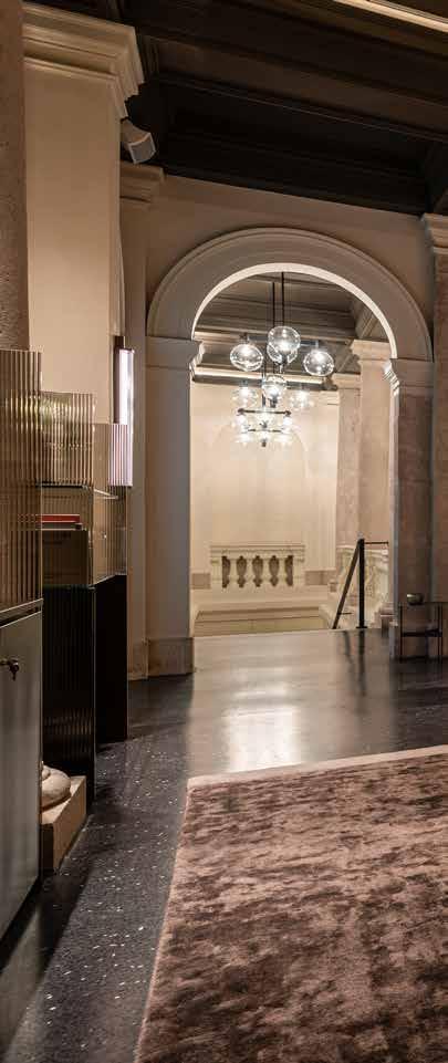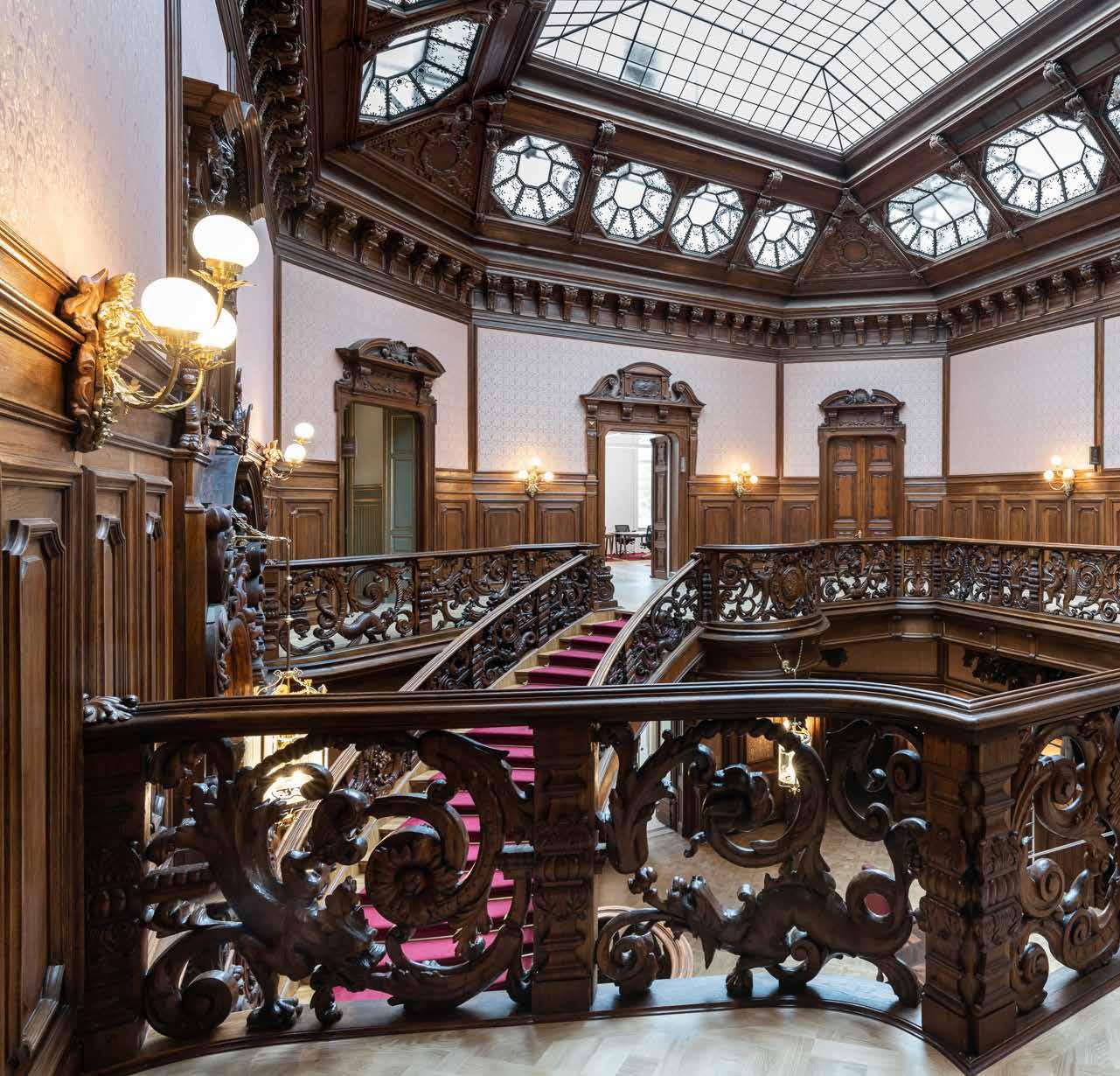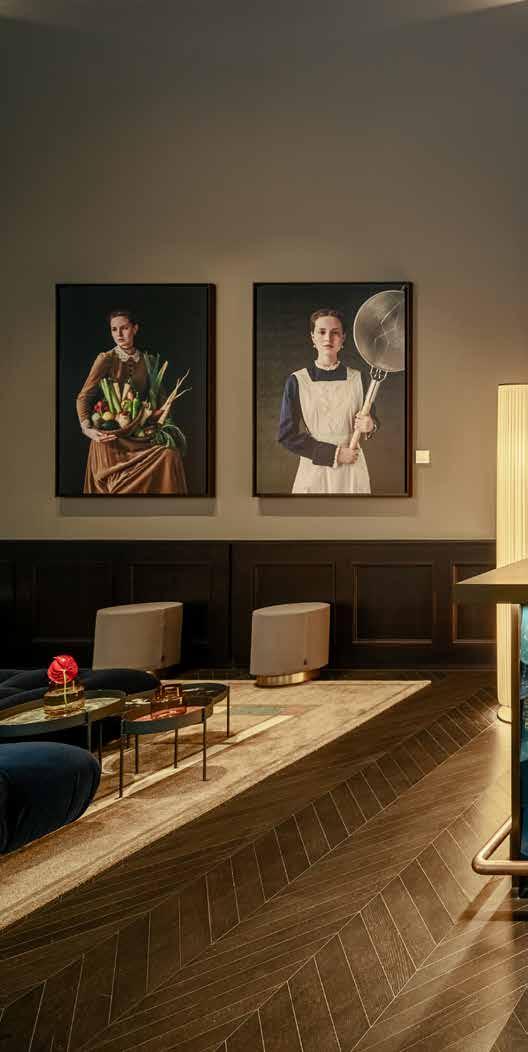 For the interior design of a restaurant in a building to be renovated, our designers chose one word to describe the whole concept: harmony. The lobby and the café are harmoniously integrated in the interior design. The concept is based on the Art Nouveau stylistic features of the building, both preserved and found in photographic archives, and their combination and reinterpretation. The rooms are characterised by strong lines, curved forms and a duality of geometric pattern, bright colours, movement and contrasts.