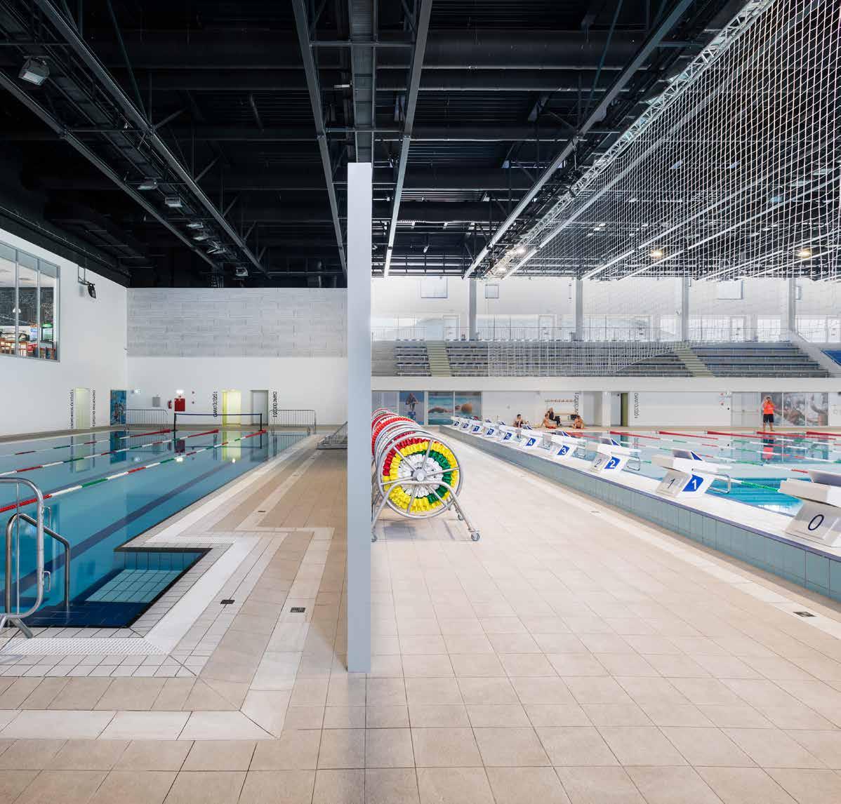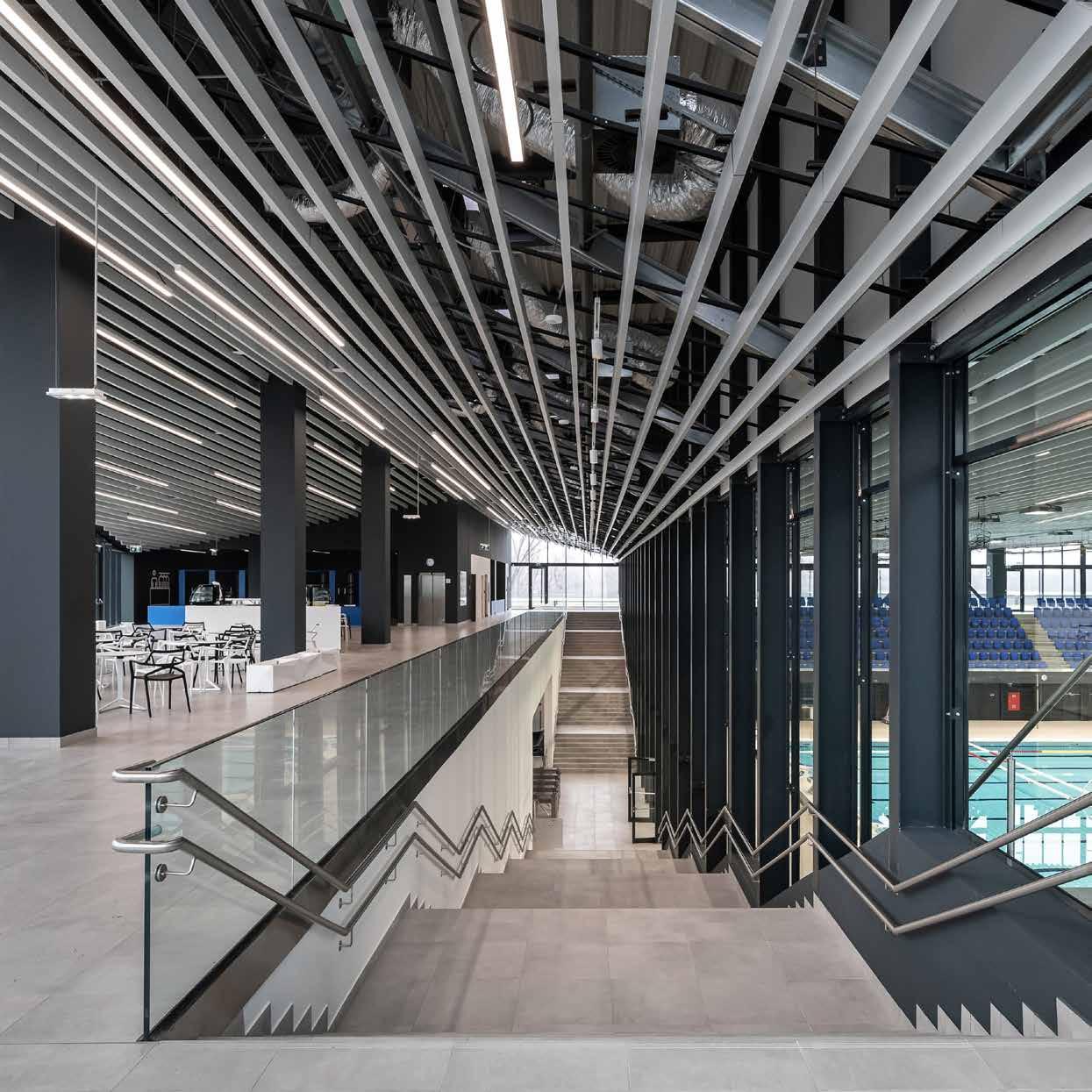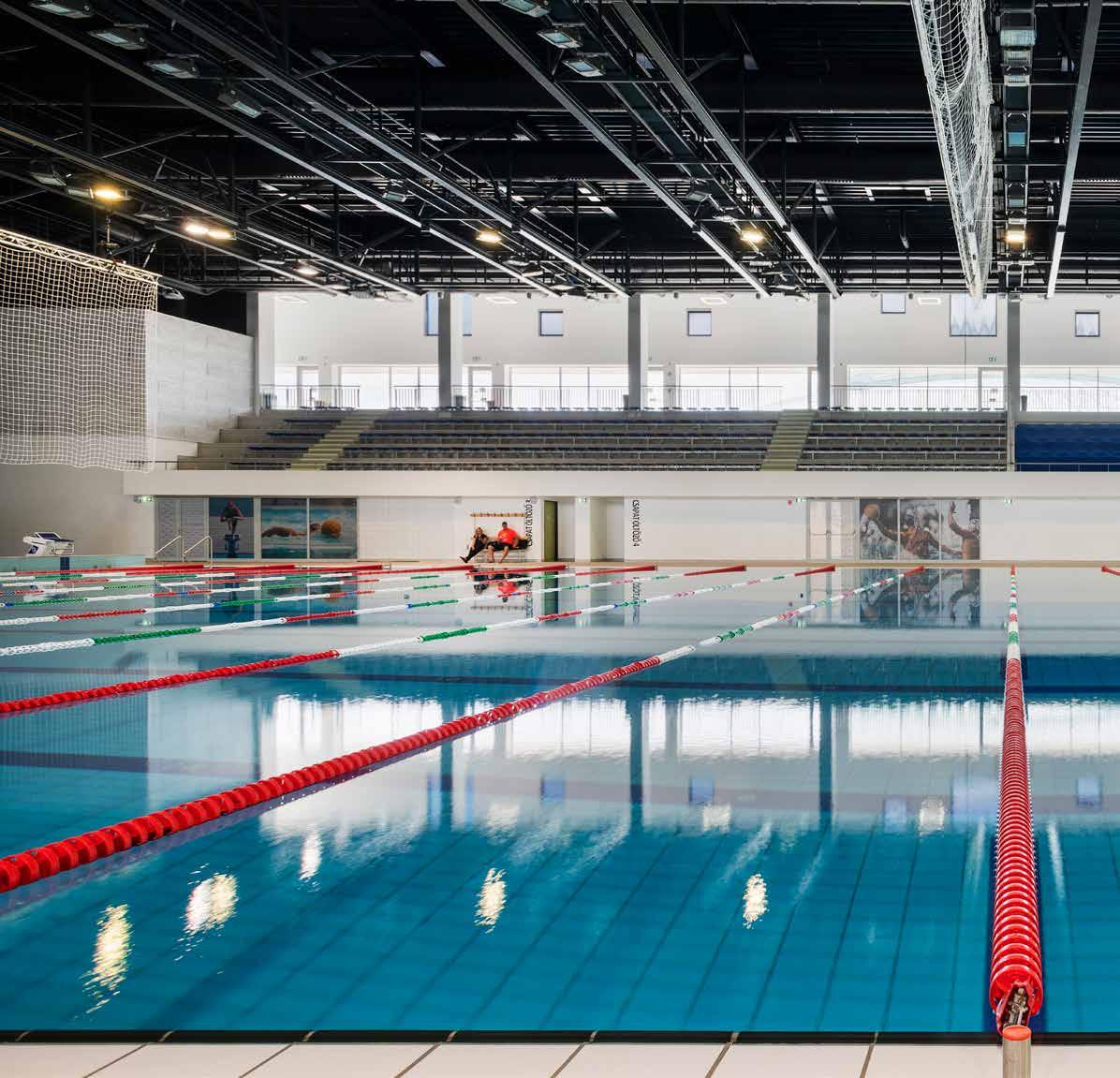 The competition pool next to the Tüske Sports Hall is located in a green environment: its shape fits in with the university environment used by young people, with character and modern solutions for sports and recreation. The building has three functional levels: basement engineering, a 50-metre competition pool and a 25-metre training pool with adjustable water depth on the ground floor, and an upstairs grandstand.