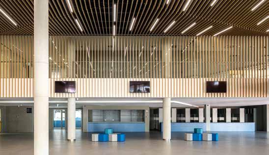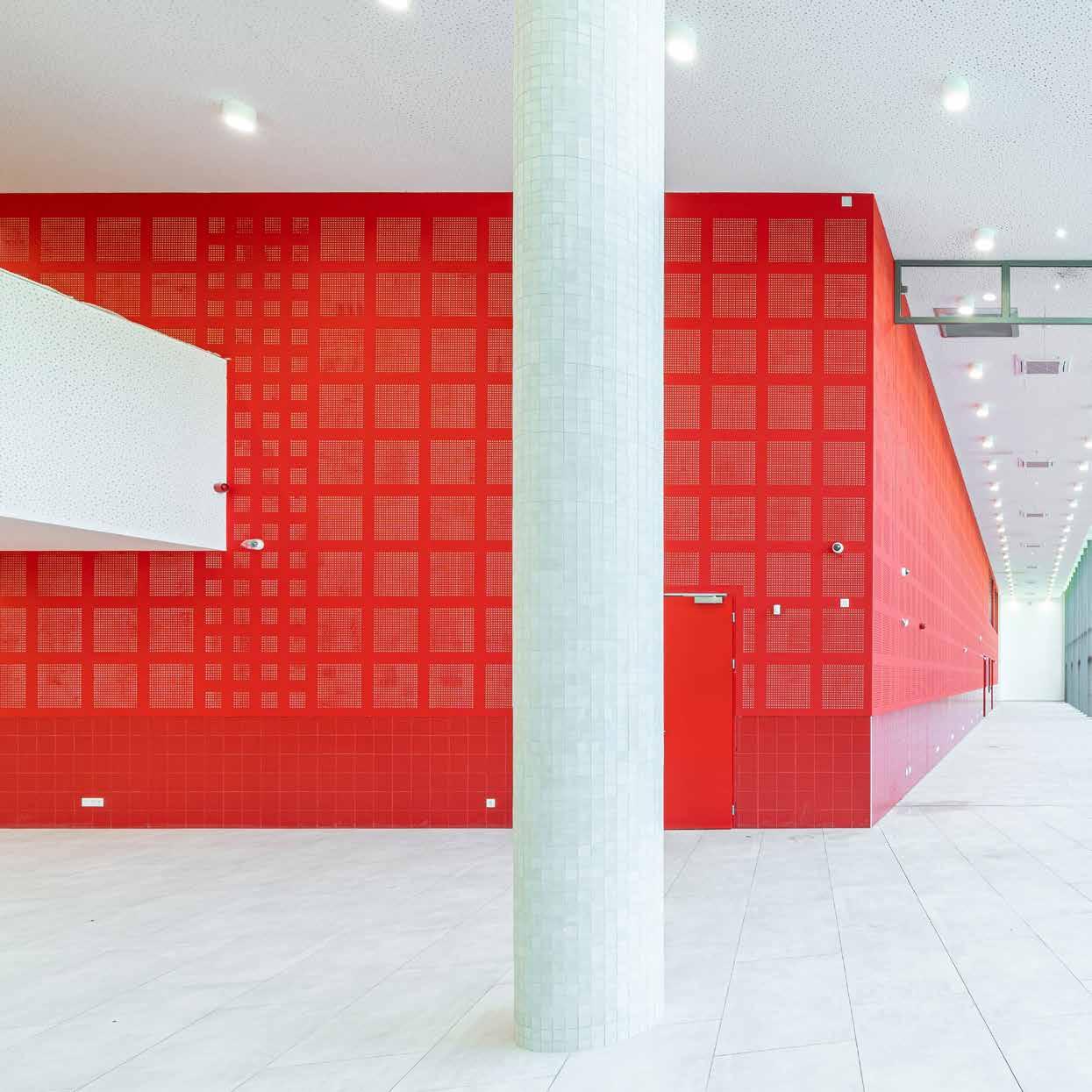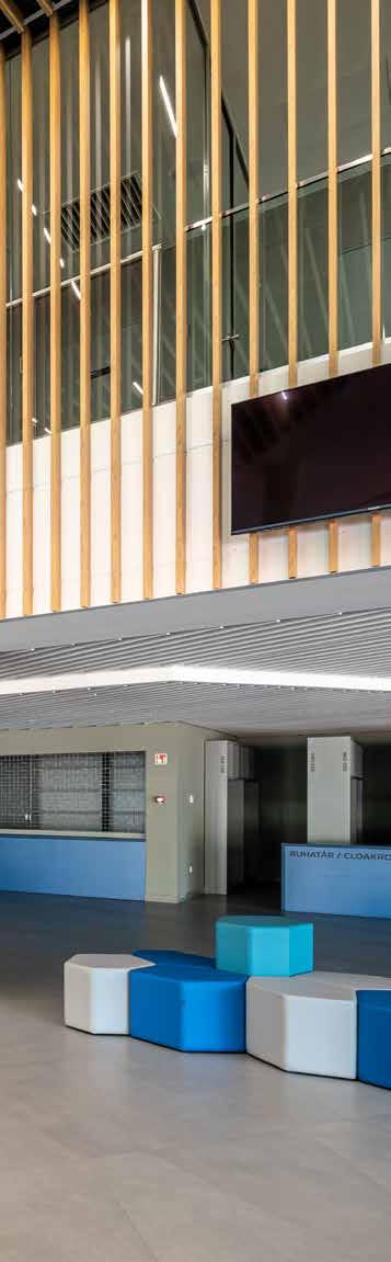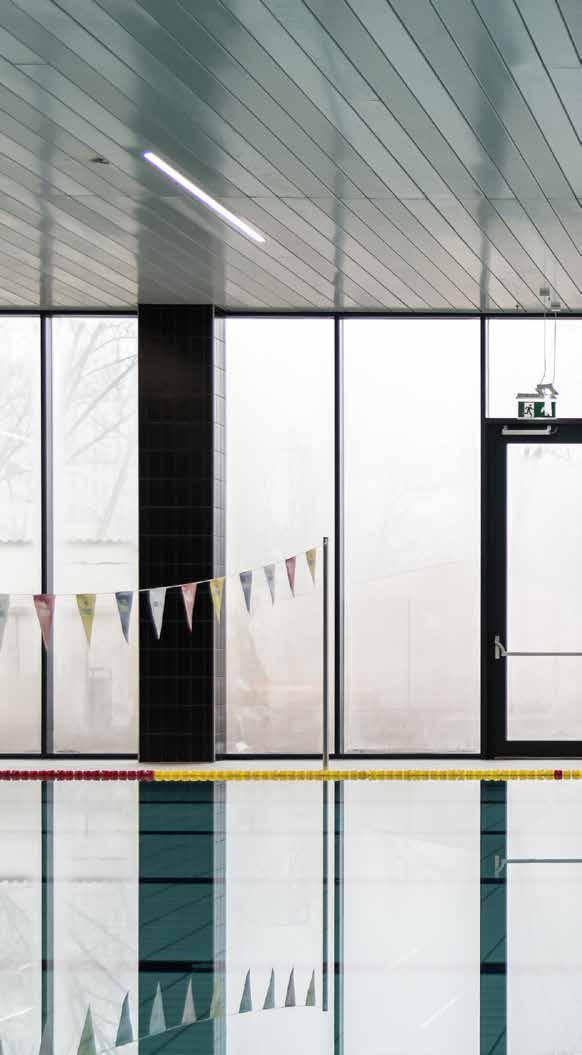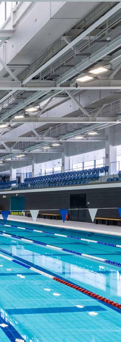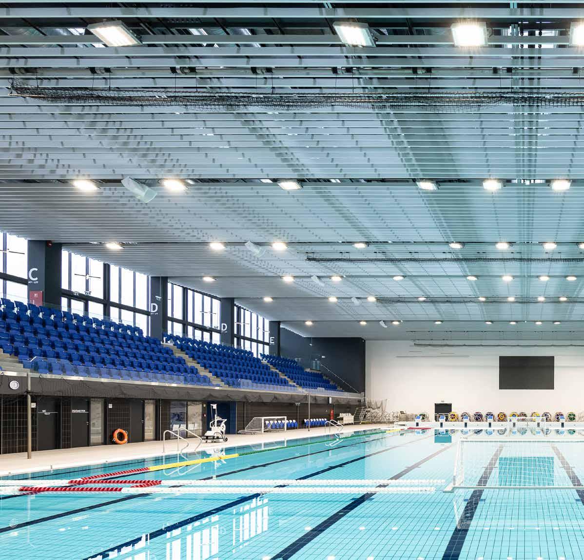 The competition pool next to the Tüske Sports Hall is located in a green environment: its shape fits in with the university environment used by young people, with character and modern solutions for sports and recreation. The building has three functional levels: basement engineering, a 50-metre competition pool and a 25-metre training pool with adjustable water depth on the ground floor, and an upstairs grandstand.