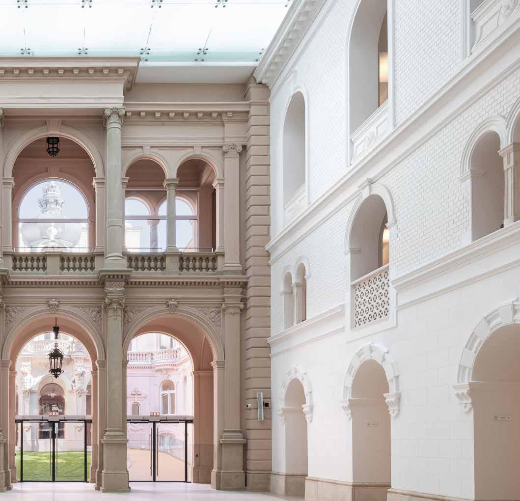 A special feature of the Museum Street wing is the Lotz fresco on the ceiling of the ballroom, once consigned to oblivion, was resurrected from the annals of history, its vibrant hues illuminating the ballroom’s celestial vault once more. The reconstruction of this representative space was aided by archival photographic material, as well as pieces of gilded plaster, marble and traces of paint found in the floor. The ceiling of the dean’s office of the Reformed University, after its restoration, thus once again depicts Lotz’s pagan Bacchus festival, bringing an exciting cultural tension to the space.