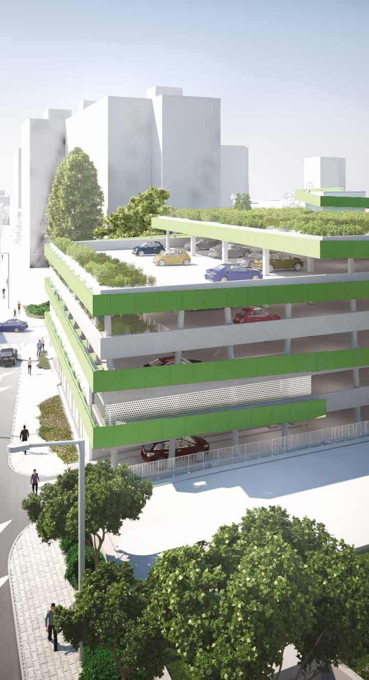 normal. Die Tiefgarage mit 500 Stellplätzen mit Ladestationen für Elektrofahrzeuge und mit Abstellplätzen für Fahrräder verbessert die Situation des Parkens wesentlich. Die sichtbaren Wände der Einfahrt der Tiefgarage sind ebenfalls durch verschiedenste Pflanzen begrünt.