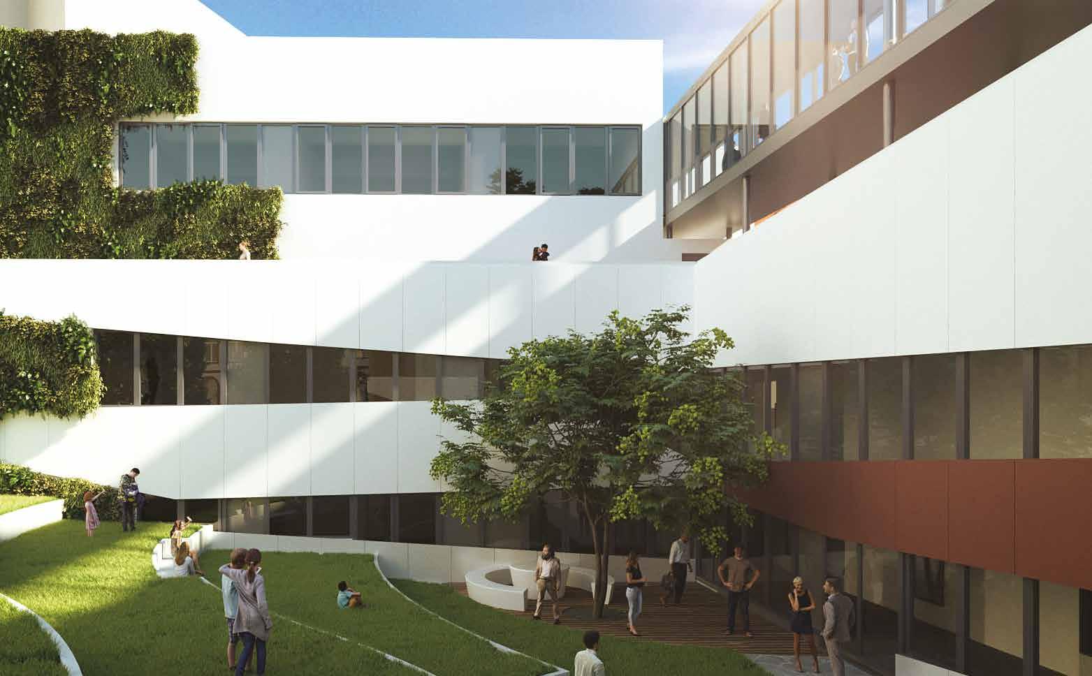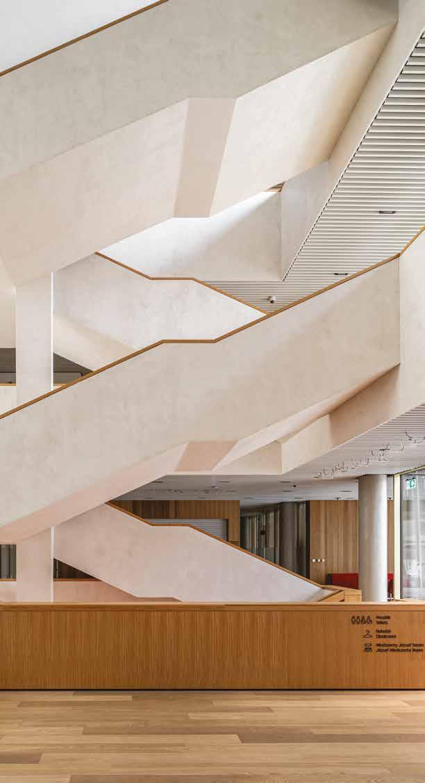 Raum. Das Atrium bietet Zugang zu einer Kantine für 250 Personen, die auch für Besucher aus den benachbarten Bildungsgebäuden zugänglich ist. Im Erdgeschoss befinden sich ein Konferenzraum mit 54 Plätzen und eine Cafeteria, die durch den Straßeneingang über die Lobby zu erreichen sind. Die Fassade des Gebäudes besteht aus Ziegeln, die einen verpixelten Effekt darstellen und somit die Digitalisierung und Technologie, die unterrichtet werden, widerspiegeln. Die gleiche Ziegelstruktur wird auch für die zum Innenhof gelegene Fassade des Gebäudes verwendet.