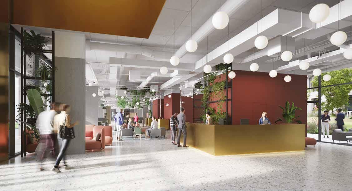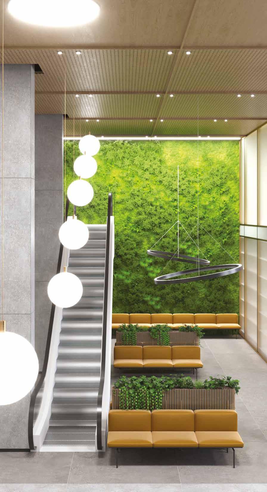 der aus die geöffnete Cafeteria und der Konferenzraum zugänglich sind. Erdgeschoss des bestehenden Gebäudes befinden sich ein Restaurant, eine Fitnesshalle sowie ein Co-Working-Büro und in den Obergeschossen sind Mietbüros mit Gemeinschaftsräumen. Die Dachebene weist eine Skybar und Dachterrasse auf.