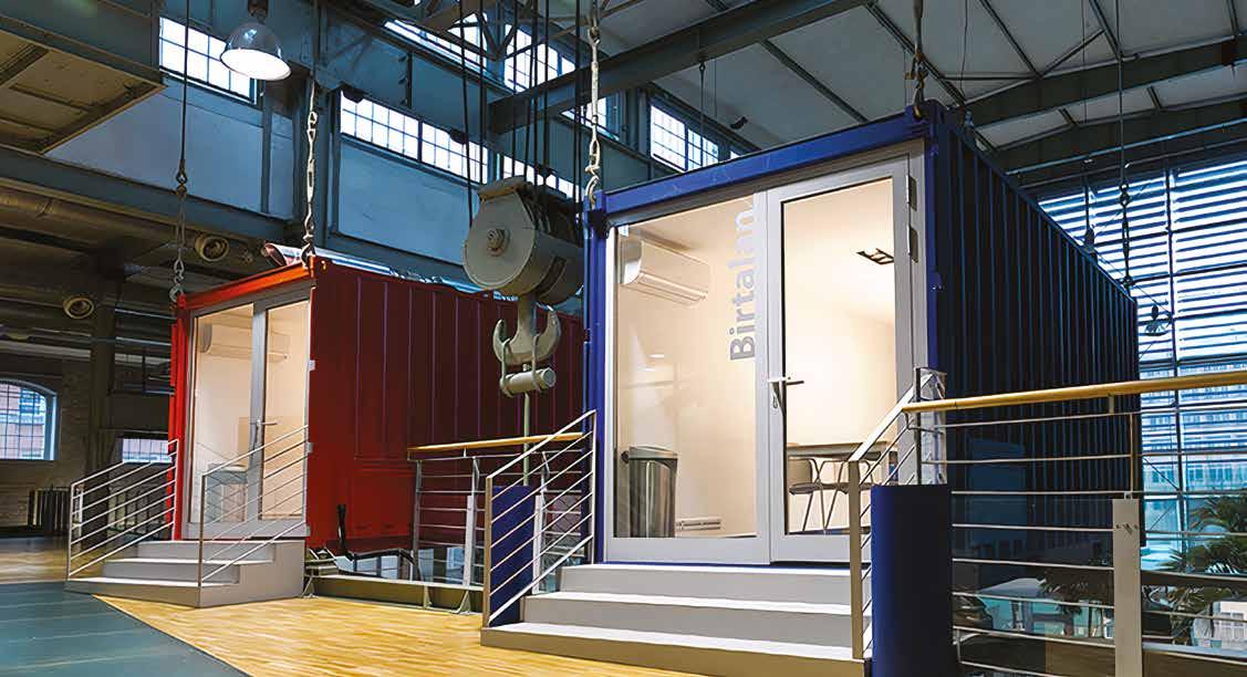 Glaswürfel für kleine Büros sowie grün-gelbe Telefonzellen, die in Miniarbeitsplätze für eine Person umgestaltet wurden. Auf dem Campus warten 183 Arbeitsplätze, 24 Büros, Verhandlungsräume und ein Kinoraum für 120 Personen.