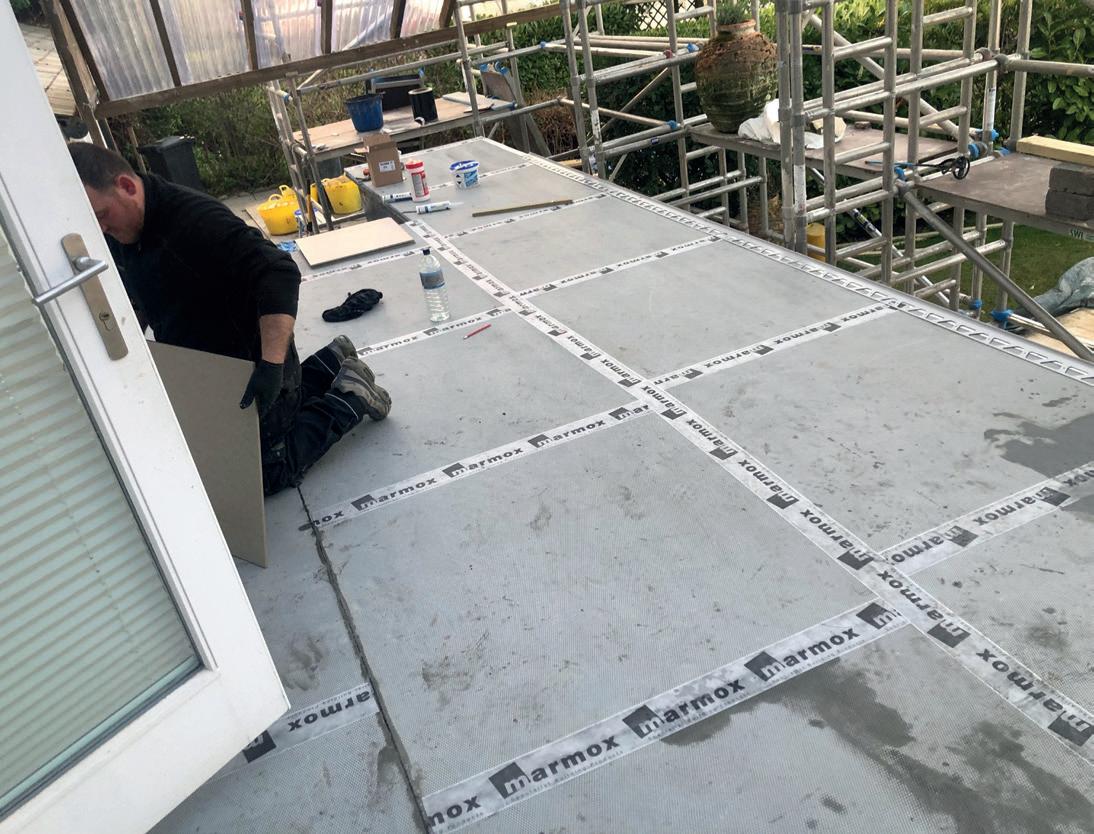 Subsequent layers, including the cut-to-falls sections, were laid with staggered 10mm joints: the uppermost being sealed using Marmox Jointing Tape. This was followed by the installation of stylish porcelain tiles with a waterproof grout detail to complete a classic, ‘inverted’ promenade deck or patio. All of the Marmox Multiboards and Marmox Tape were supplied through Boyden Tiles in Croydon.