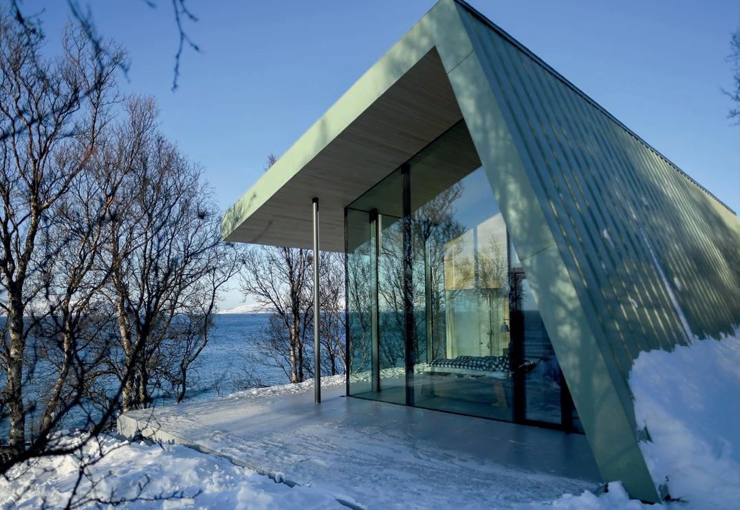 In a stunning seashore location on Norway’s Lyngen peninsula, a protected heritage area well within the Arctic Circle, Snorre Stinessen Architecture’s lodge design is based on a natural platform in the landscape protected by an angular canopy. This forms the eastern wall and roof – clad entirely in Nordic Green pre-patinated copper – providing high indoor ceilings. The copper enclosure contrasts with wide-open views of the surrounding nature, including the northern lights in winter, through extensive, seamless glazing. The same approach is taken with the two outbuildings, also enveloped with Nordic Green copper, which was chosen for its durability, permanence, quality and beauty as a natural material. ENQUIRY 3