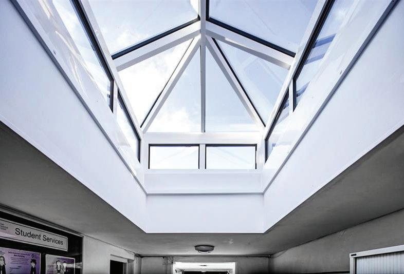 specified for the space which connects the adapted Kiln and North Engine House and the existing Cross Mill. This rooflight is constructed in accordance with BS 5516 and BS 1474 from aluminium glazing bars with thermal barrier and four panes of glass. Due to the 5° pitch and location of the self-supported rooflight, Howells selected Class 2 non-fragility glazing. It was glazed onsite using 28mm double glazed units with a 6mm toughened and Easy Clean outer pane and 9.5mm clear inner pane. Once again, the centre pane achieves a 1.0 W/m2K U-value.
