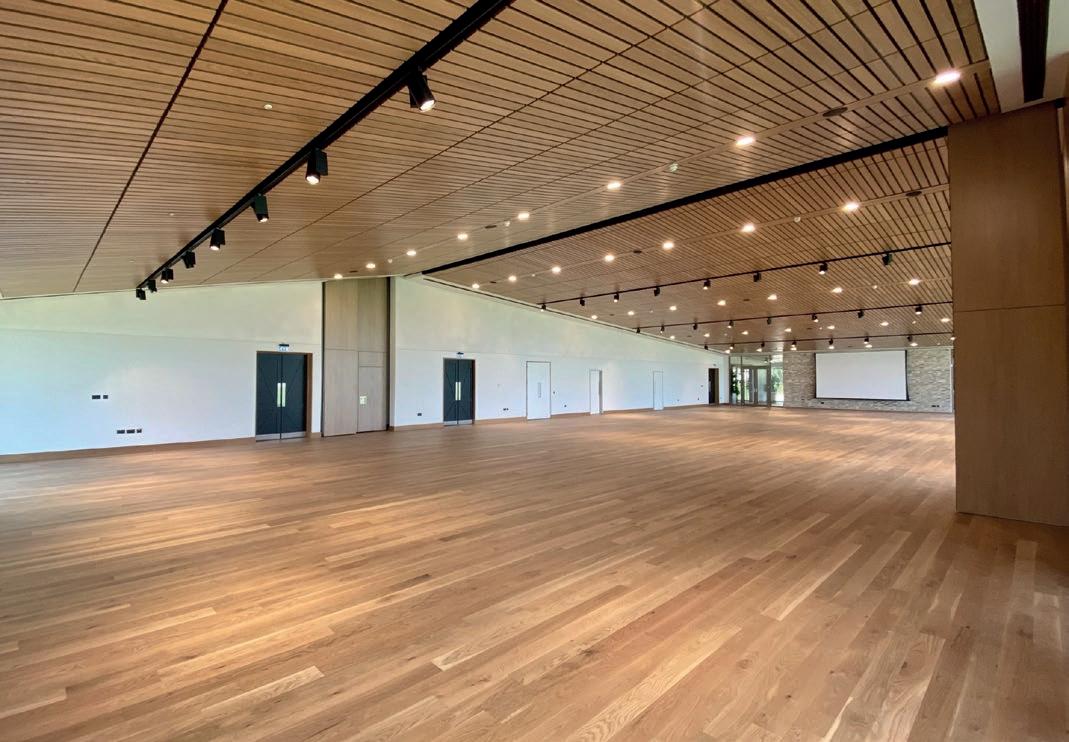 An open wood ceiling and wall panelling, manufactured by Hunter Douglas Architectural, take pride of place at the new £4.8 million pavilion for the Royal Highland and Agricultural Society of Scotland (RHASS). The first-class events and conferences facility at the Royal Highland Centre, Ingliston, near Edinburgh, was designed by Holmes Miller and at 1880m2 is now one of the biggest hospitality spaces in the city. For the main events space, global architectural products provider Hunter Douglas Architectural was specified to supply 475m2 of European Oak Veneer Linear cassettes for the sloping ceiling, enabling easy access to the services, as well as Topline perforated wall panels with European Oak Veneer.