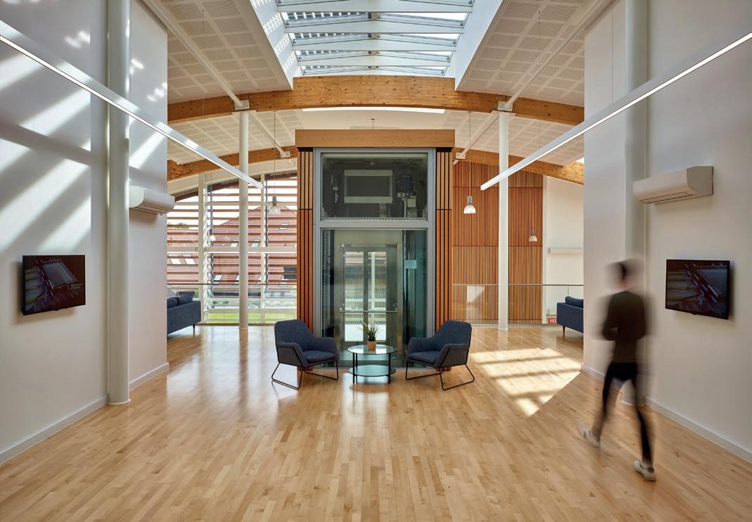 When roof window manufacturer VELUX built a new extension at their UK and Ireland head office, Junckers solid wood flooring was the perfect choice to enhance the light-filled space. Over 800m2 of Junckers 22mm Beech Harmony two-strip flooring was fitted throughout, forming a unifying surface which links every part of the building, including the impressive entrance, circulation and breakout areas. The contemporary interior uses natural light to full effect, in a perfect demonstration of how VELUX roof windows help create spaces filled with natural daylight, one of the targets of the RIBA 2030 Climate Challenge and an essential ingredient for user wellbeing. A light-coloured floor such as beech reflects a lot of natural light which helps enhance lighting levels, further reducing the need for artificial light, and therefore saving energy.