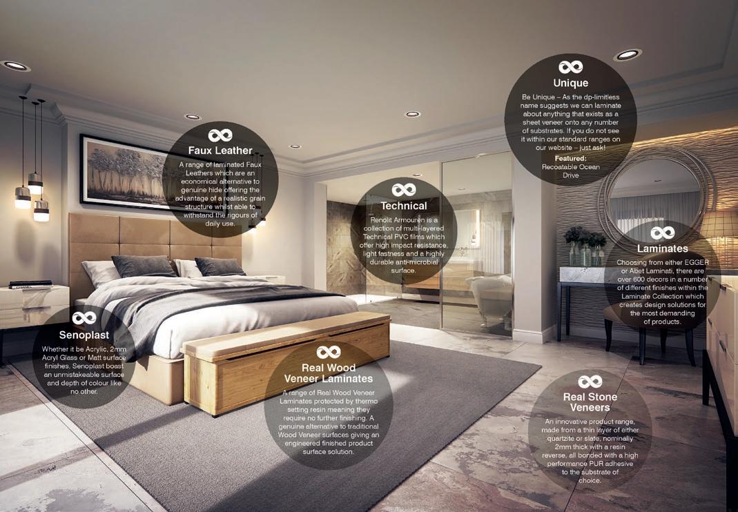 The dp-limitless range offered by the company continues their innovative approach and supplies a range of specialised decorative and high performance products available without commitment to bulk quantities and is deliverable from single sheets up to full load quantities – from stock. dp-limitless is a range that offers exactly what the brand says, a limitless number of surface finishes bonded to the substrate of choice. The core range is extensive and includes an array of materials and finishes including: High Pressure Laminates, Senoplast Acrylics, 2mm Senoplast Acryl Glass, Real Stone Veneer, Faux Leather, Natural Wood Veneer Laminate, Technical Surfaces and of course Unique, one off surface finishes providing contemporary and traditional bespoke surface solutions manufactured in the UK.