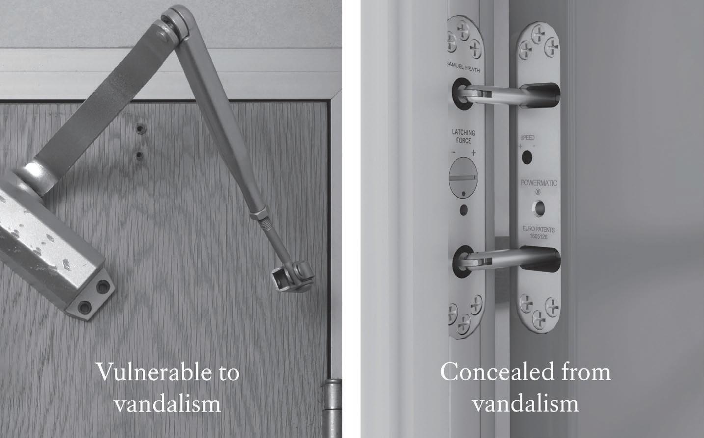 Unlike surface-mounted door closers, Powermatic is completely concealed when the door is closed, and not easily visible when open. This can significantly reduce the opportunity for the door closer to be vandalised, tampered with or removed.