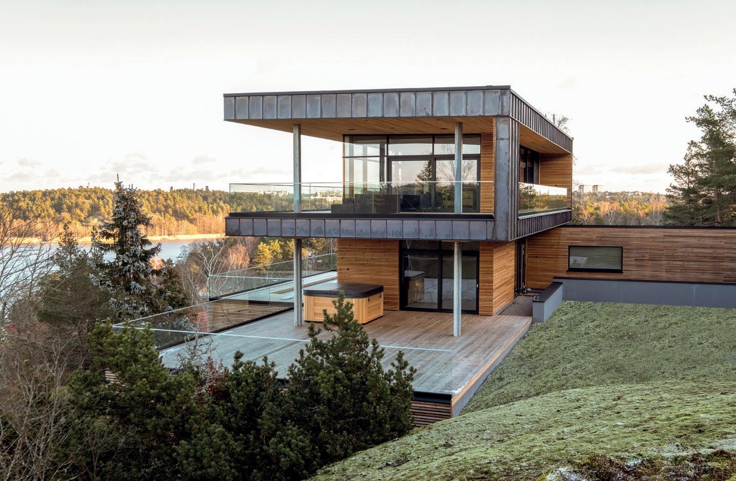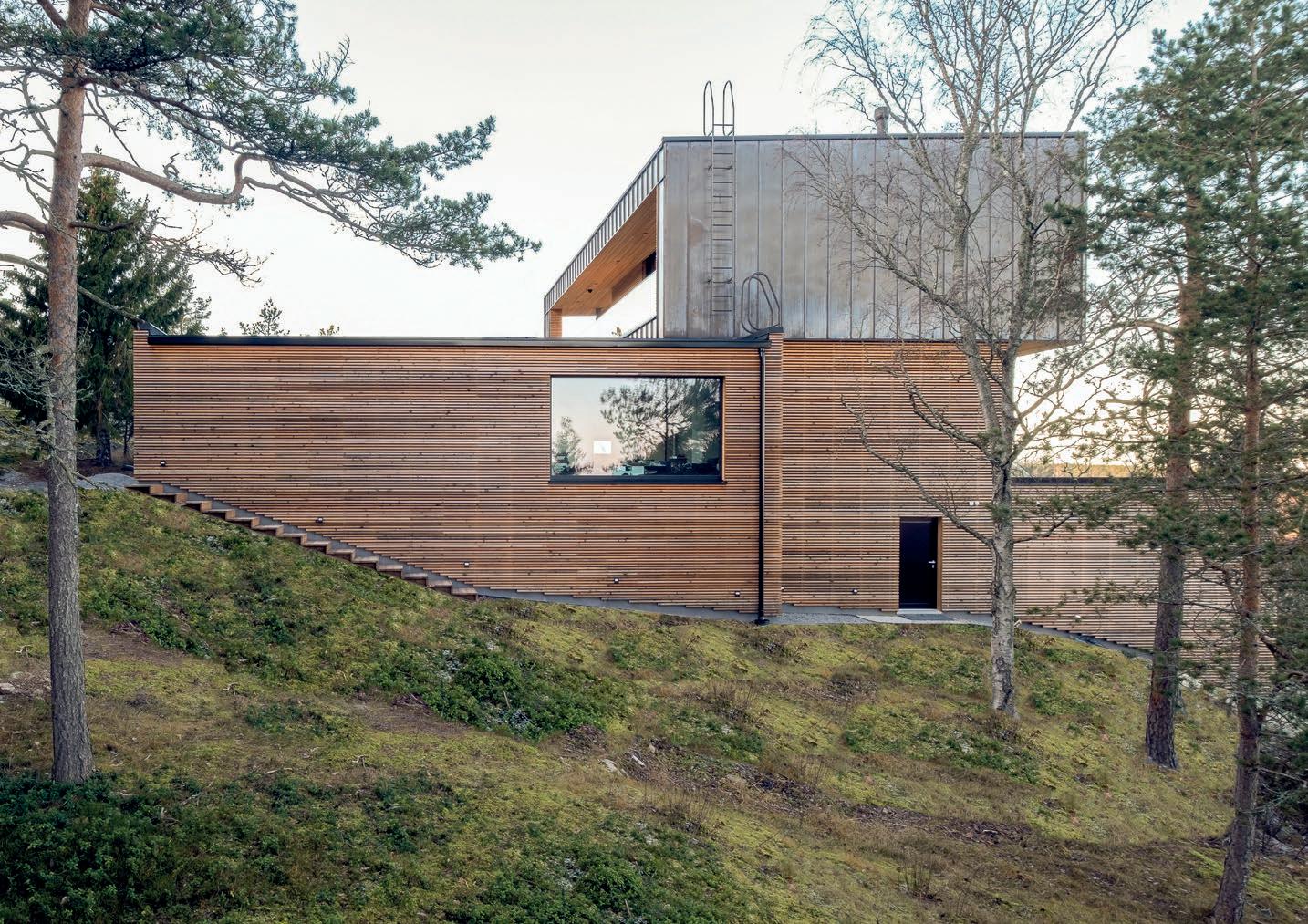 Nordic Brown pre-oxidised copper and larch cladding together define the natural character of a contemporary home, nestling amongst the treetops on the Island of Hirvensalo, part of the Turku archipelago in Finland.