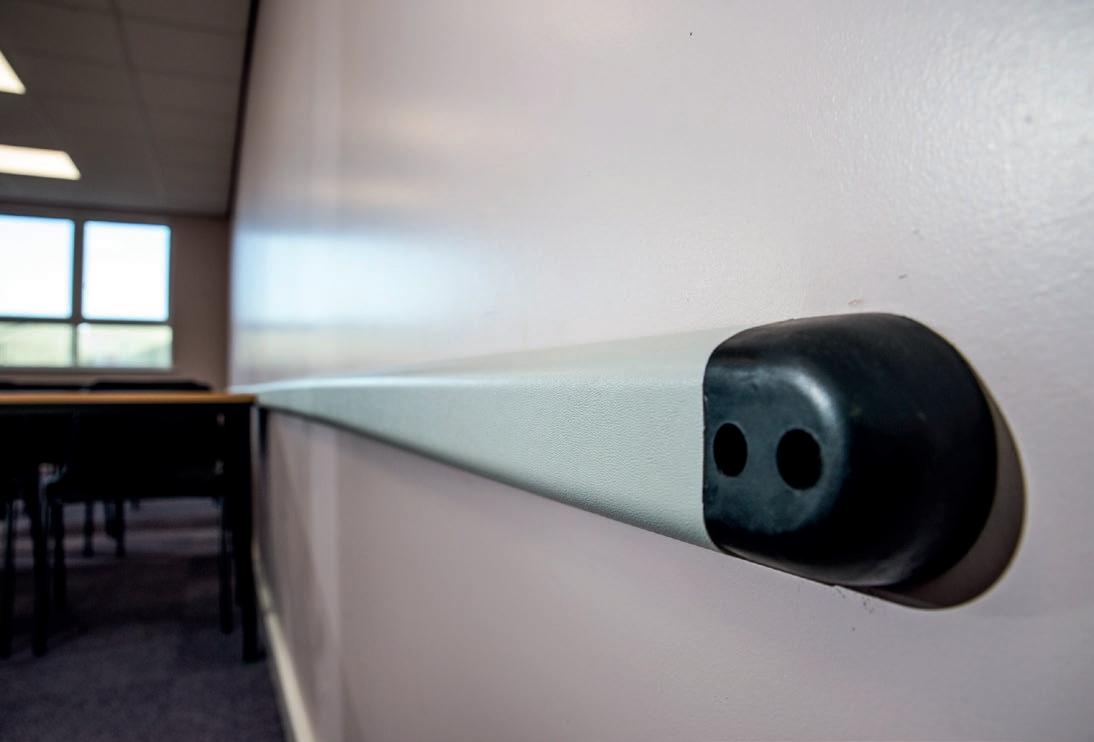 Rockfon® Koral™, a versatile, white micro-textured ceiling tile with a wipeable surface is easy to keep clean. The activity hall, activity suite and fitness room in the sports hall sees Rockfon® Scholar™ ceilings offering Class A sound absorption which reduce the level of reverberation.