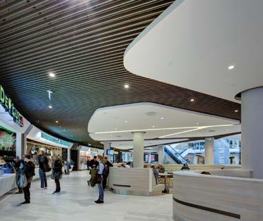 Hunter Douglas’s first major ceiling project using an engineered solid wood (ESW) baffle system at a UK shopping centre has been hailed a huge success. Award-winning international architects Benoy, which designed the £8 million refurbishment at Queensgate Shopping Centre, Peterborough, specified Hunter Douglas to manufacture the ceiling for all the main areas of the mall. The leading architectural products company manufactured and supplied 1100m2 ESW grill ceiling, with slat dimensions of 150mm x 25mm and a 75mm gap. A total of 1000m2 was finished in pure white RAL9010, while the remaining 100m2 was finished in walnut veneer. Hunter Douglas also manufactured and supplied 1500m2 of Cell 50E – its aluminium open cell system – with a 120mm module in white for the scheme.