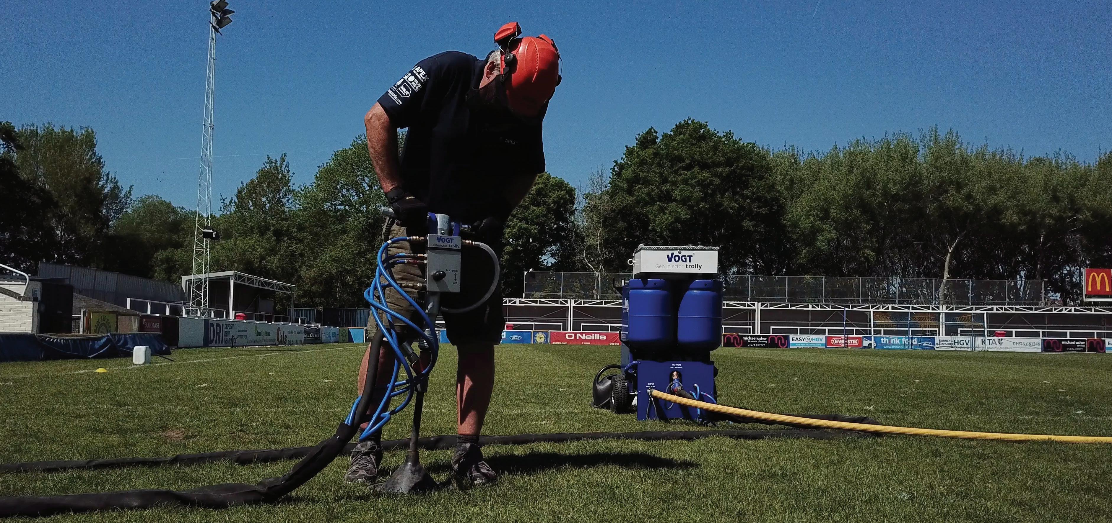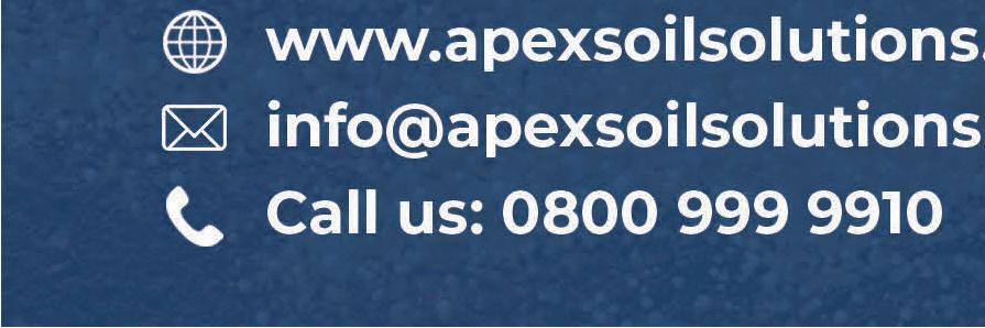 Groves, Editor The process is completed in one motion with just a single probe. We penetrate the soil beyond the root zone to a depth of one metre then inject 100psi of high pressured, compressed air into the ground. Whilst the probe is inserted into the ground, a natural underground void is created and then back filled with Terramol to the surface, creating a permanent drainage soakaway. www.apexsoilsolutions.com info@apexsoilsolutions.com Call us: 0800 999 9910