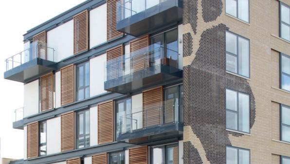 A mixed-use development at Highams Park in north-east London boasts a collection of contemporary apartments and terraced houses, all fitted with custom sliding Timber Screening Panels by Levolux. Levolux engineered the sliding Screening Panels from Western Red Cedar timber, complementing the Timber Fins it installed across the Tesco superstore’s entrance and on several other residential buildings that were completed in 2012. The sliding Timber Screening Panels are fitted externally and Levolux delivered 40 sliding Timber Screening Panels divided equally between two apartment blocks, with four panels arranged per floor, across five floors. Panels are suspended from a concealed track.
