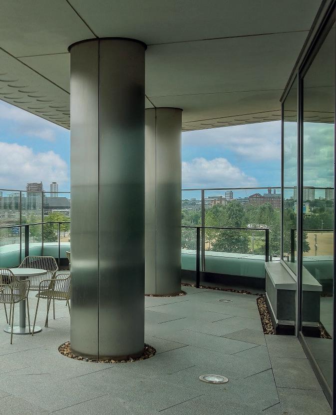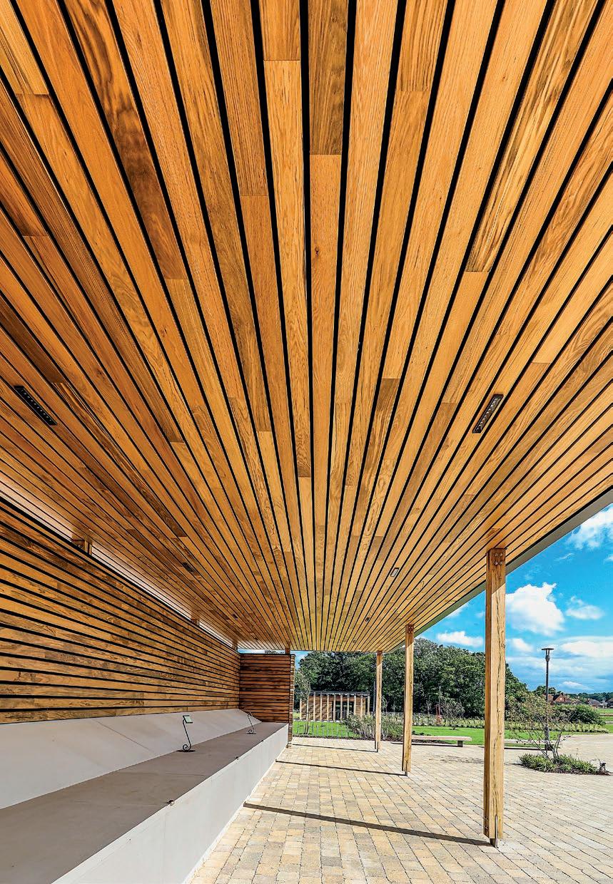 At the heart of the design were sustainability and improvement of biodiversity. Hunter Douglas, the global architectural products company, was specified to supply 246m 2 of European Oak linear for the external soffits and walls and Accoya solid wood for the façades at the main entrance and tower.