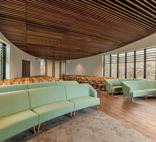 The solid wood panels are FSC certified and are fire treated to B-s1-d0 and B-s2-d0. For the chapel, Hunter Douglas supplied 143m2 FSC-certified European Oak solid wood grill ceiling.
