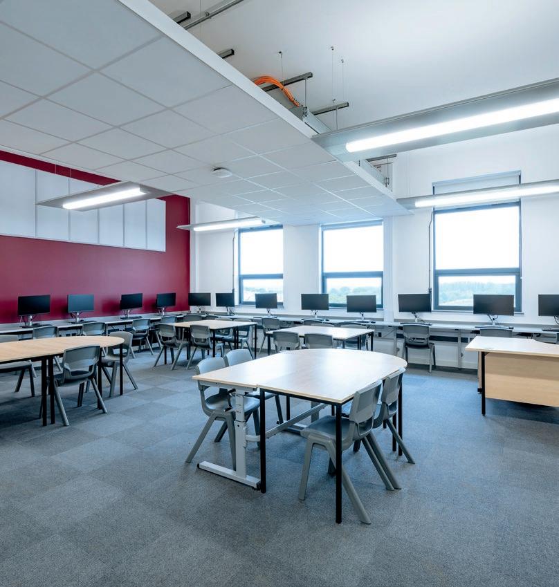 To help combat the problems of poor acoustics and sound reverberation in the sports hall, music and drama rooms, Hawkins Brown specified Troldtekt acoustic panels across all the ceilings.