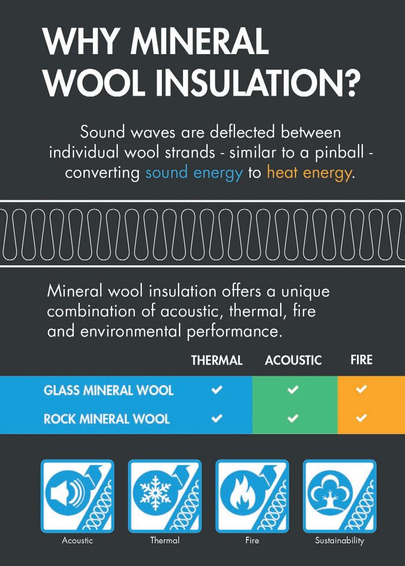 Both glass mineral wool and rock mineral wool (or ‘stone wool’) contribute to thermal efficiency, fire safety, acoustic performance and sustainability.