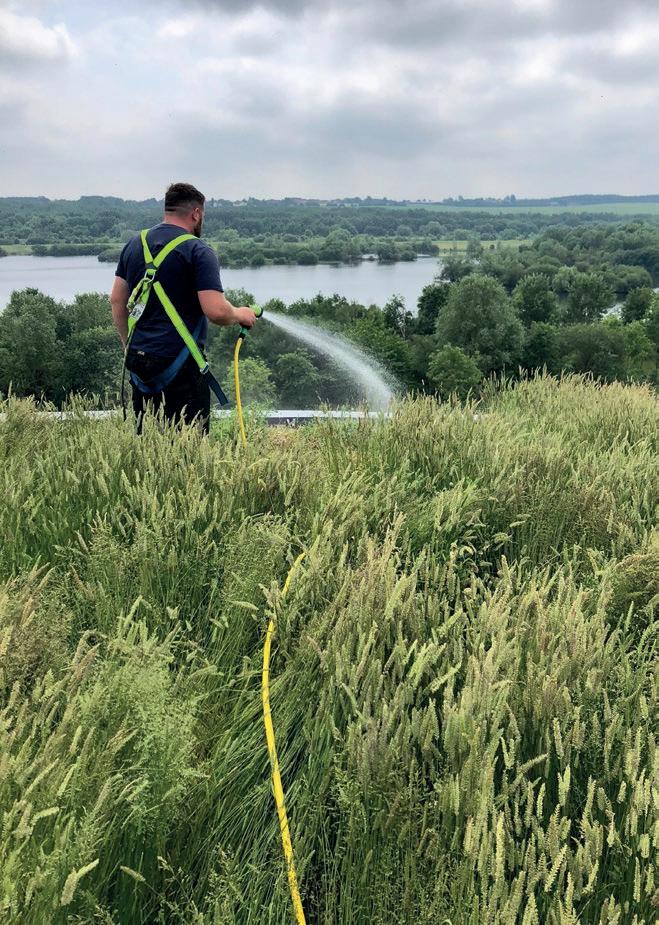 For the base of the living roof structure, a combination of 20mm and 40mm deep ABG Roofdrain reservoir and drainage geocomposite is installed. The geocomposite includes a geotextile at the top to filter soil particles, and one underneath as a secondary filter and protection layer. The main core structure of the HDPE reservoir board features a matrix of storage cups to attenuate storm water and provide irrigation of the wildflower and sedum planting during dry periods. The geocomposite is supplied in 920mm wide x 50m long rolls, with 110 rolls installed in total at Skelton Lake Services.