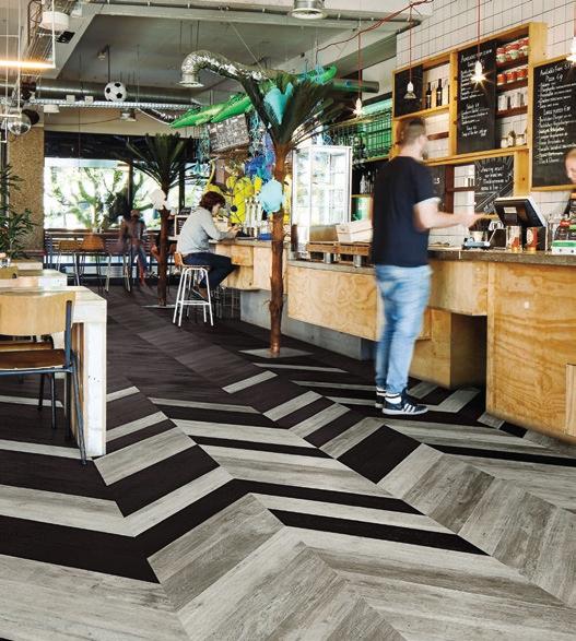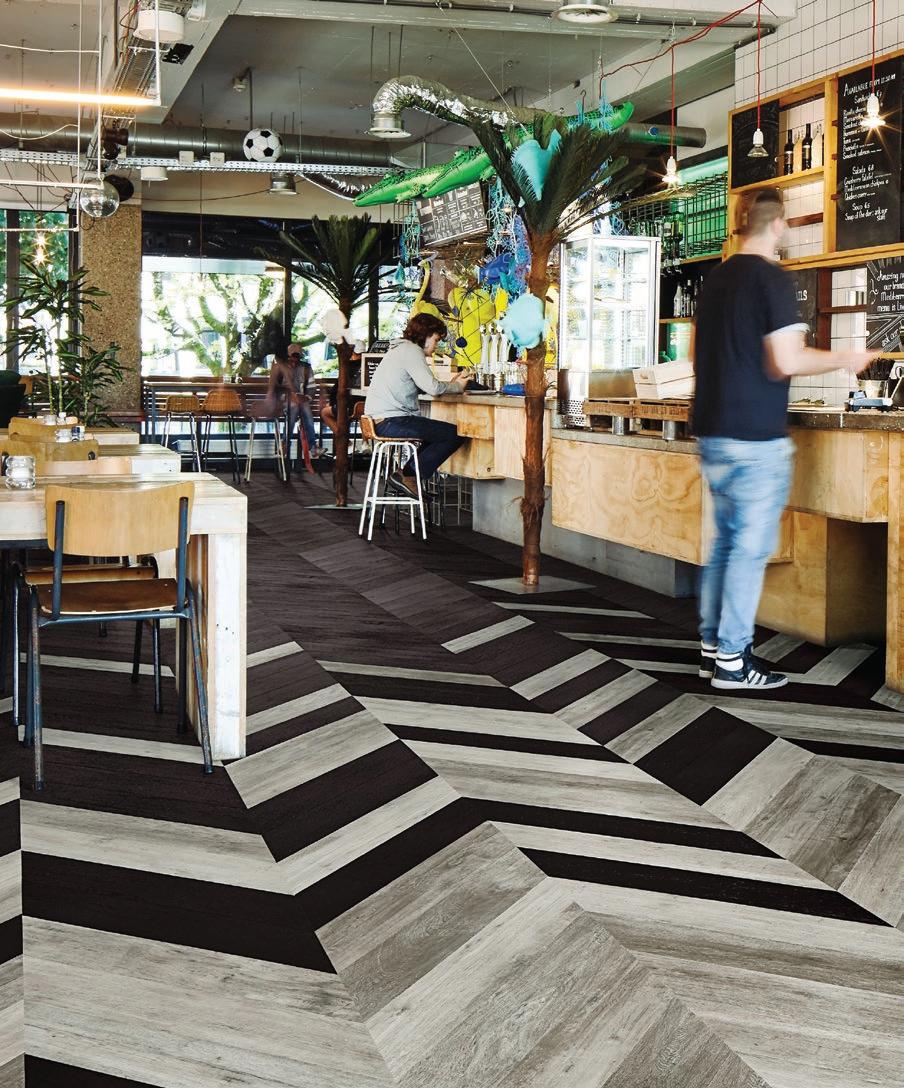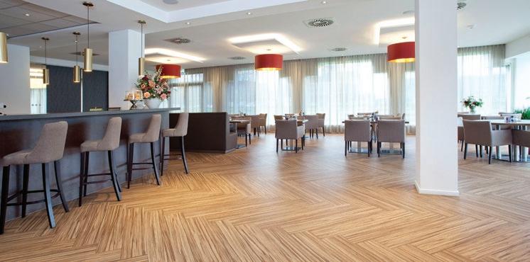 Contractors at refurbishment specialists, Calmack, specified authentic shades of stone and walnut from Moduleo’s popular Transform collection to overhaul the main reception, shop, seating and dining areas.