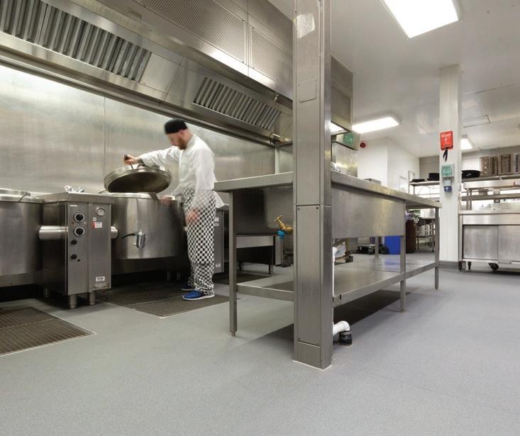 Heavy-duty safety flooring with enhanced slip resistance from Polyflor’s Polysafe Apex range was recently installed in the busy commercial kitchen at the Radisson Blu Hotel Athlone. Polysafe Apex vinyl safety flooring in the Chromite shade was chosen for a 450m² kitchen area. Polysafe Apex is a high durability safety floor which provides sustainable wet slip resistance and underfoot protection where there are regular spillages of more viscous oil and grease contaminants. It features a high concentration of traditional safety aggregates within the vinyl to ensure high traction and sustainable wet slip resistance.