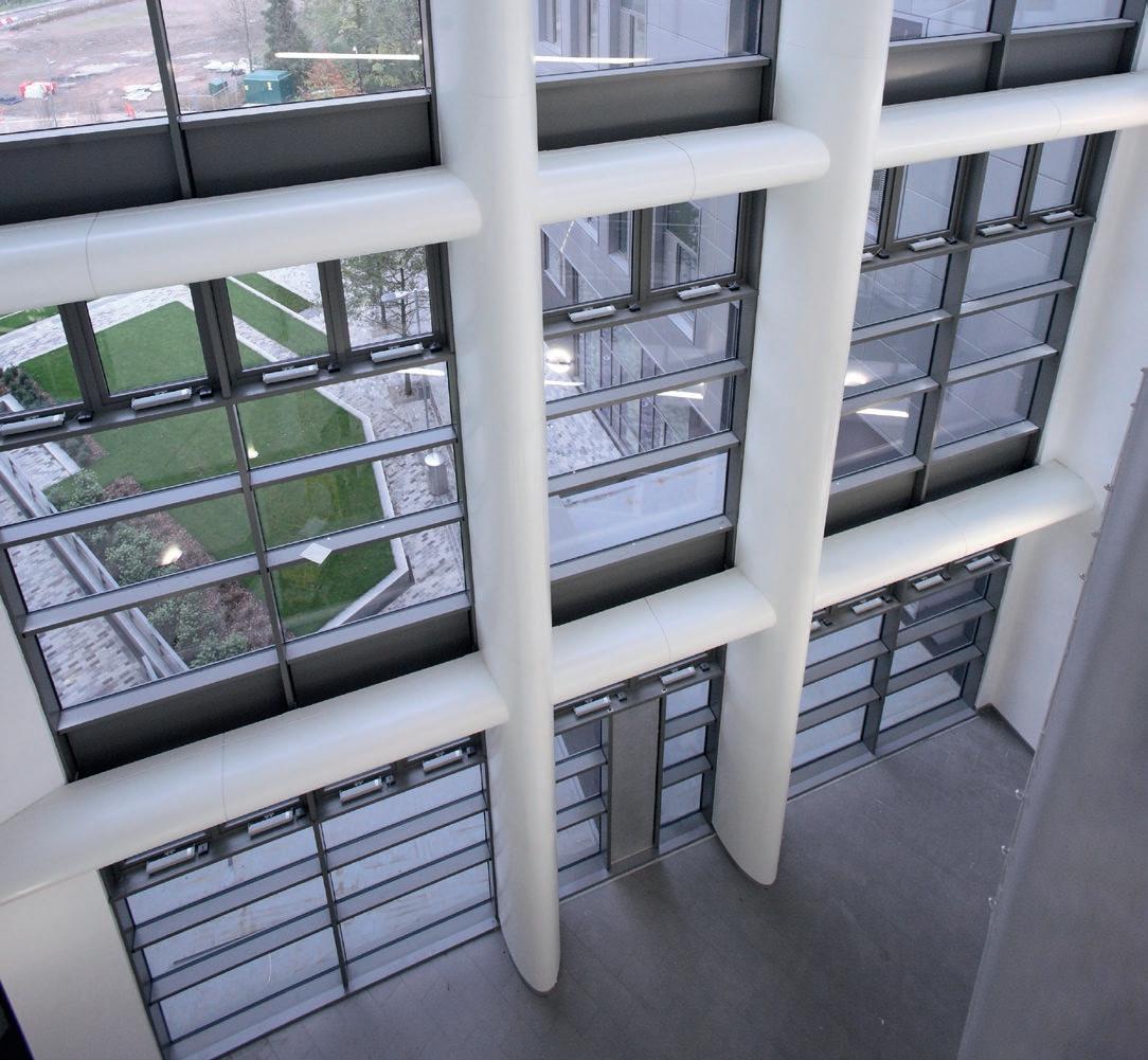 To soften the visual impact of the building from the street, Levolux was invited to develop an external solar shading and screening solution, comprising vertical Aerofoil Fins and horizontal and vertical glazed panels. In total, 141 vertical Fins are distributed across three levels. Levolux also integrated a series of vertical and horizontal glazed sections into the screening solution.
