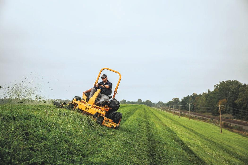 weeds and heavy brush. It is, in fact, a highly efficient rotary deck with a large front opening that directs material to three heavy-duty counter rotating blades that cut and deposit waste evenly without windrowing.