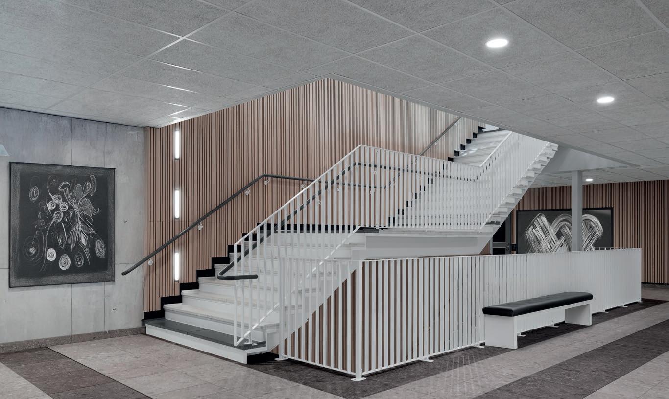 In practice, Troldtekt Plus 25 is a twolayer panel but only 25 mm thick, just like Troldtekt’s traditional single-layer panels. A special acoustic liner made of non-woven acoustic fleece is applied to the back of the panel and ensures high sound absorption. As a suspended ceiling, Troldtekt Plus 25 has a so-called alpha value of 0.9 (αw = 0.90), which means that it can achieve Class A sound absorption at a suspension depth of 200mm. The fact that the panel excels in the low frequencies (125-250 Hz) makes it perfect for applications such as classrooms and meeting rooms.