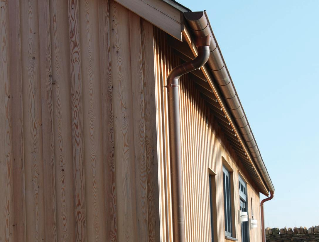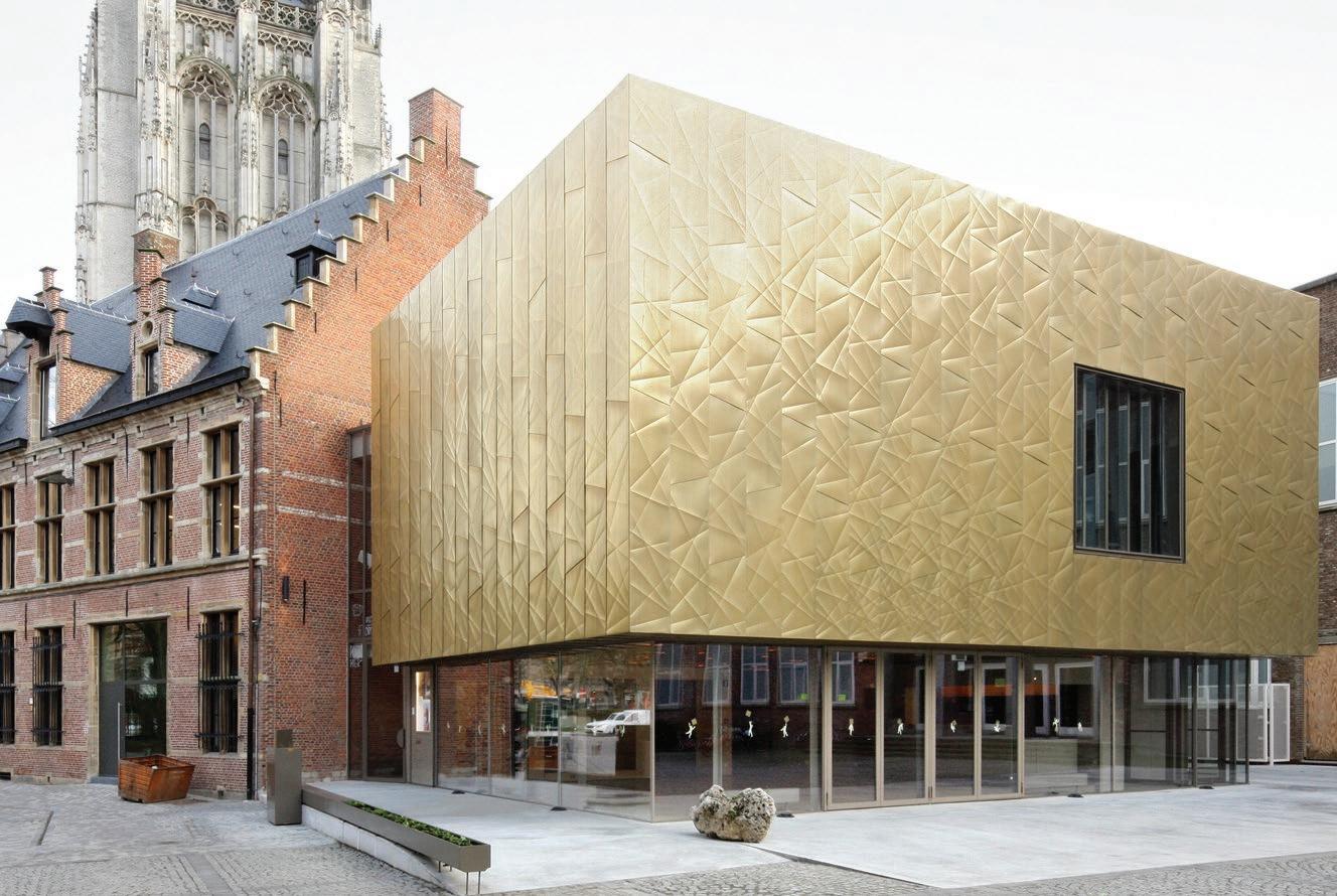 At the heart of the Moon’ children’s art centre in Mechelen, Belgium, is a new theatre complex – a golden cube defined by creased Nordic Royal copper alloy cladding. The architects worked with specialist fabricators Ridder, resulting in a series of gentle creases – almost, but not quite, 3-D. Then, seven different designs of panels were produced using press moulds, each with folds running across at various angles and intensities. By rotating and intermingling different panels a rich, random effect was created. The verticality of the overlapping panels is retained, giving structure to the facades, but most transverse joints are not horizontal, further fragmenting the surface. Nordic Royal is produced by Aurubis, part of the world’s leading integrated copper group and largest copper recycler