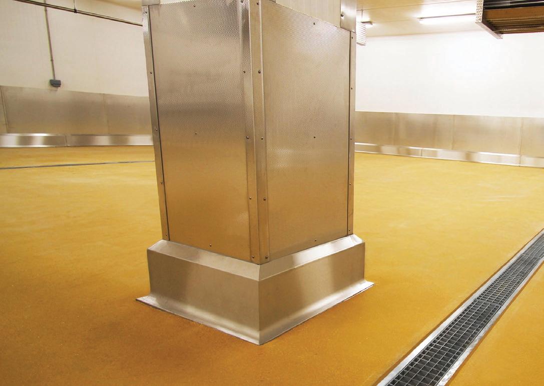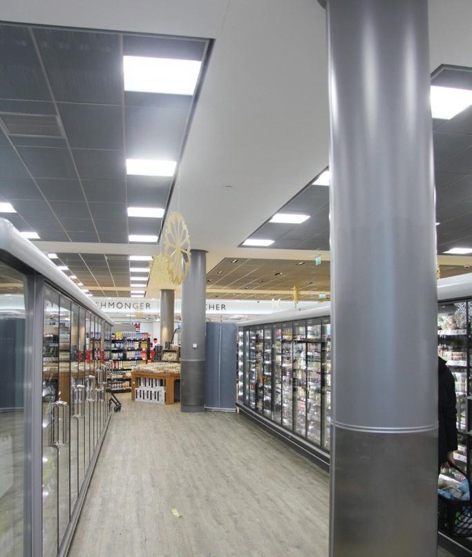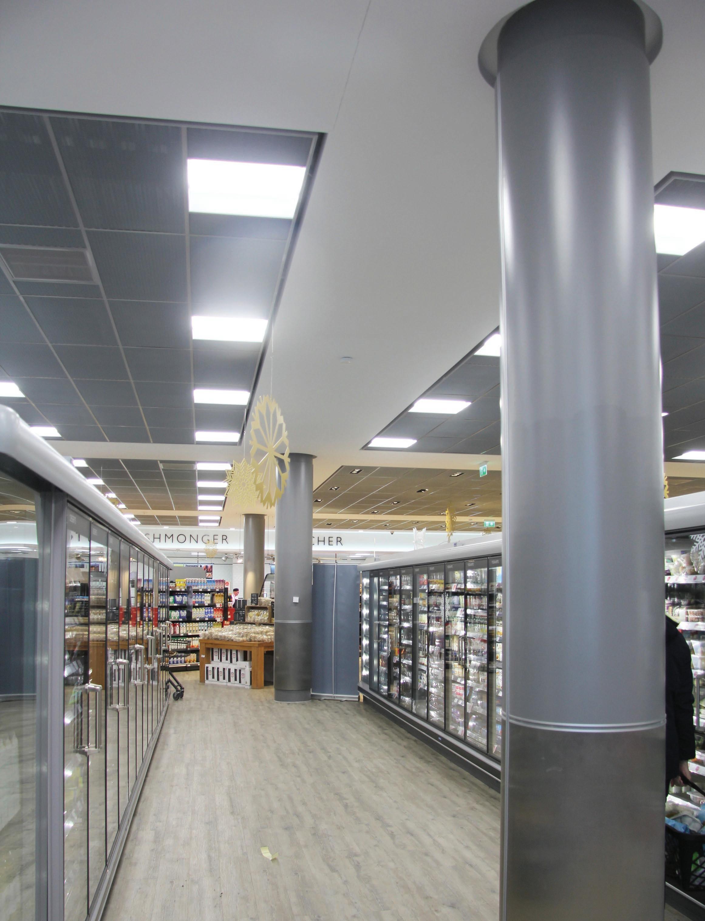 Booths has relocated one of its stores to Poulton-le-Fylde and selected of high quality column casings from Pendock for the interior fit-out. Pendock supplied nine column casings to surround the standard structural steel sections: three oval in appearance and the other six circular. For continuity of style, both types are clad with attractive brushed finish aluminium bonded to the plywood casings up to one metre in height, while above this a RAL 7037 Dusty Grey shade of the company’s Mouse Laminate was specified, rising to ceiling height. Pendock’s column casings are available with a very wide selection of finishes and can incorporate lighting or other services.