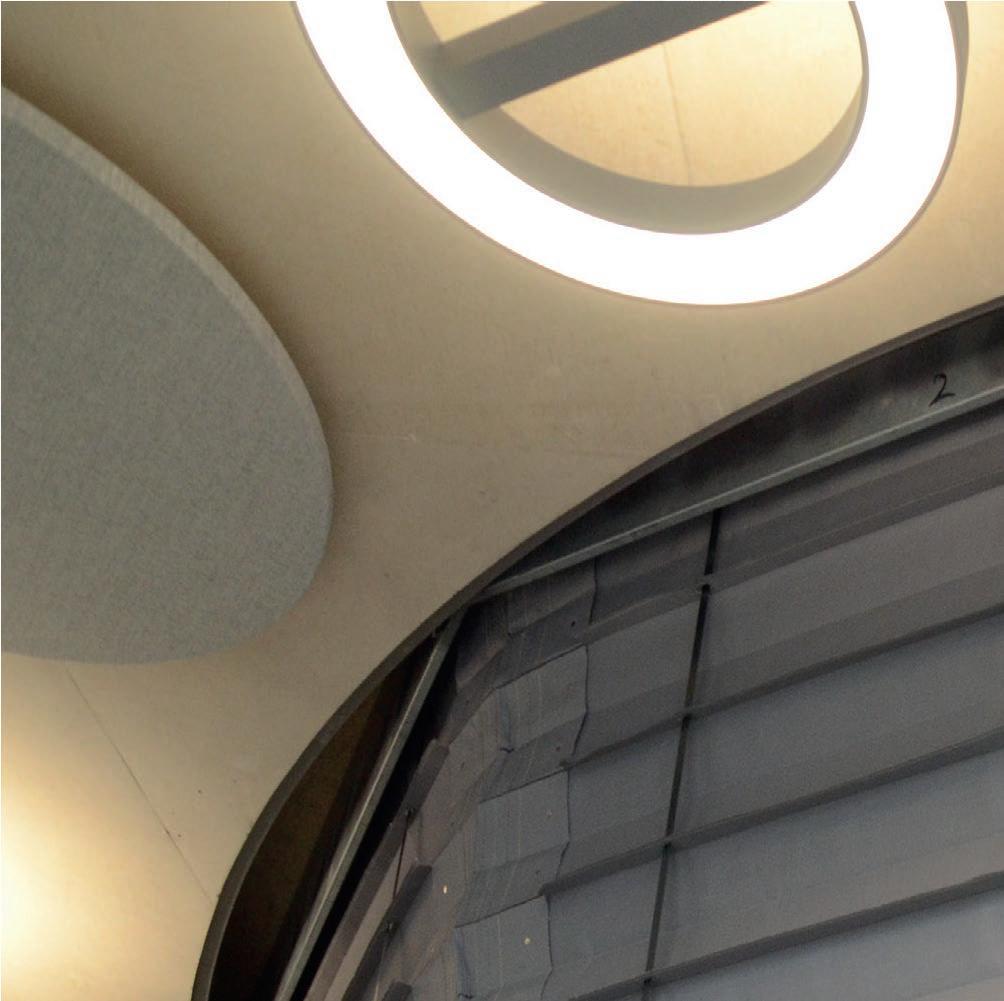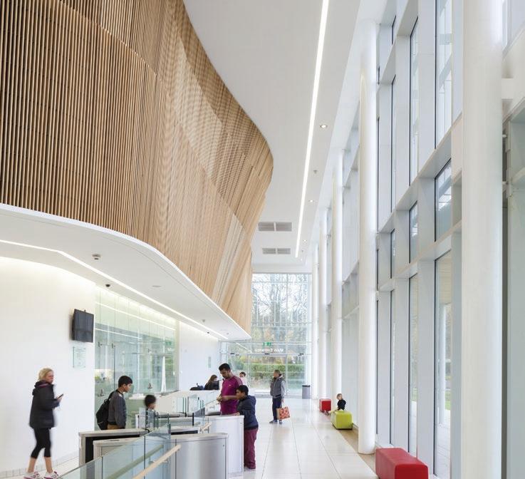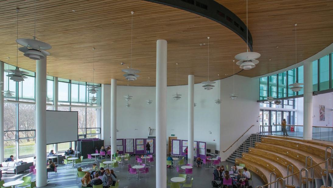 The impressive £120m Garthdee Campus development at Robert Gordon University in Aberdeen, Scotland, enabled Hunter Douglas to showcase its ability to deliver simple, yet stunning products. The globally renowned architectural products manufacturer was commissioned to design and manufacture 450m2 circular floating ceiling in the impressive reception area at the Sir Ian Wood Building. The creation of a wood, open linear ceiling provides a natural feel within an ultra-modern building that is otherwise constructed from glass, hard masonry and cladding. Using multi-width module American Red Oak Linear Open ceiling system softens the overall look and complements the wood amphitheatre-style bench-style seating.