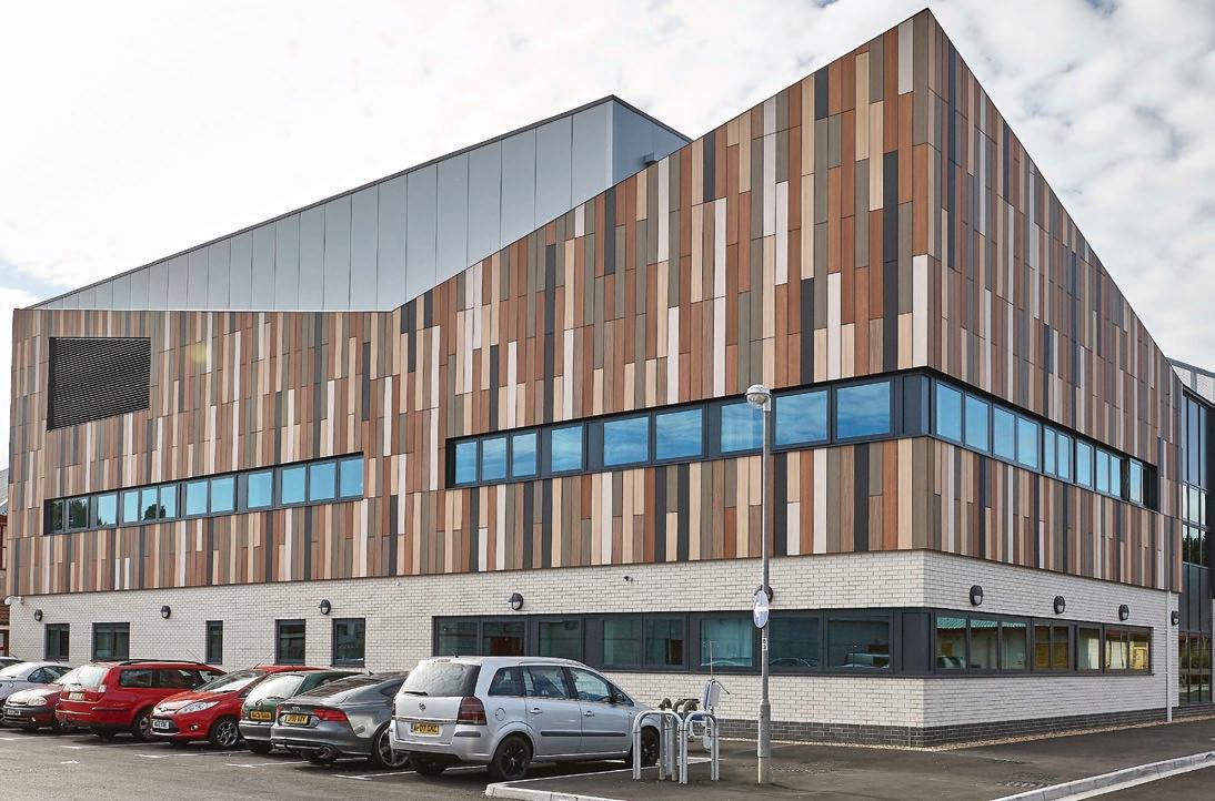 Architects Stride Treglown selected Trespa Meteon cladding for the ventilated façade at the new Jigsaw Building at the Royal Bournemouth Hospital. The building is wrapped in variegated tones of Trespa Meteon Wood Decors cladding on the first floor, punctured with ribbon windows, white brick to the ground floor and an undulated roof form to conceal roof top plant. Trespa Meteon is a decorative high-pressure compact laminate (HPL) with an integral surface manufactured using the company’s unique in-house technologies; Electron Beam Curing (EBC) and Dry Forming (DF). The blend of up to 70% natural fibres manufactured under high pressures and temperatures yields a highly stable, dense panel with good strength-to-weight ratios.