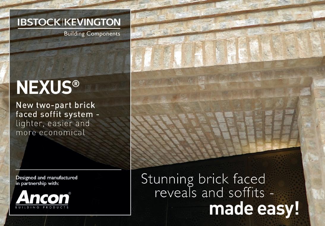 A new eight-page brochure and online animation from brick support specialist, ANCON, show just how simple it is to create suspended masonry soffits on virtually any brick building, regardless of soffit dimensions, brick type or bond pattern. The new resources are available at www.ancon.co.uk/Nexus. Ancon’s recommended solution and latest innovation, Nexus, developed in partnership with cut brick specialist Ibstock Kevington, offers a modular lightweight steel alternative to cast concrete brickfaced soffits. The Ancon-Ibstock Nexus system is easier to handle on site than precast concrete soffit systems, without the need for mechanical lifting equipment, meaning it is far faster and simpler to fix and provides contractors with a more costeffective solution.