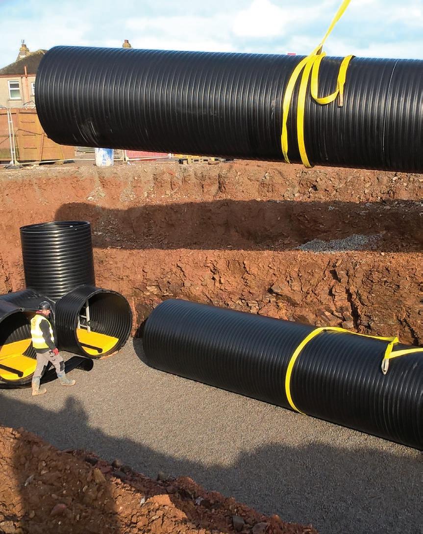 Water management specialists JDP has supplied large diameter HDPE pipes for a stormwater attenuation tank to provide effective water management and protect a new housing development in Wheal Harmony, Redruth.