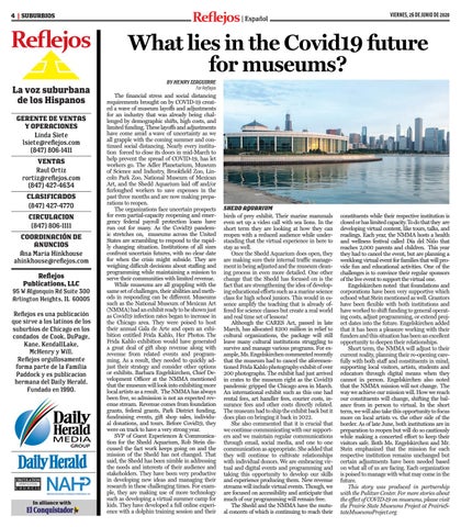 What lies in the Covid19 future for museums? La voz suburbana de los Hispanos GERENTE DE VENTAS Y OPERACIONES Linda Siete lsiete@reflejos.com (847) 806-1411 VENTAS Raul Ortiz rortiz@reflejos.com (847) 427-4634 CLASIFICADOS (847) 427-4770 CIRCULACION (847) 806-1111 COORDINACIÓN DE ANUNCIOS Ana Maria Hinkhouse ahinkhouse@reflejos.com Reflejos Publications, LLC