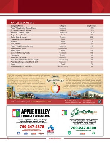 M A J O R E M P L OY E R S Company Name Apple Valley Unified School District St. Joseph Health St Mary’s Wal-Mart Logistics Center Target Stores, Inc. (2 stores) Stater Bros. (2 stores) Lowe’s Home Improvement Wal-Mart WinCo Foods Apple Valley Christian Centers Town of Apple Valley Home Depot Century 21 Fairway Realty Albertsons McDonald’s (2 stores) Bear Valley Fabricators & Steel Supply Applebee’s Neighborhood Bar & Grill Kmart American Integrity Company
