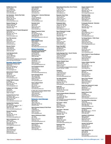 Restaurants, Food & Beverages Arnie’s Cafe Mary Garrett 1609 S. Main Ave. Warrenton, OR 97146 (503) 861-0520 Astoria Brewing Company & Chart Room Steve Allen 1196 Marine Dr. Astoria, OR 97103 (503) 741-3037 www.wetdogcafe.com Astoria Coffeehouse & Bistro Jim Defeo 243 11th St. Astoria, OR 97103 (503) 325-1787 www.astoriacoffeehouse.com Astoria Portway Tavern David Warner 422 W. Marine Dr. Astoria, OR 97103 (503) 325-2651 www.theportway.com